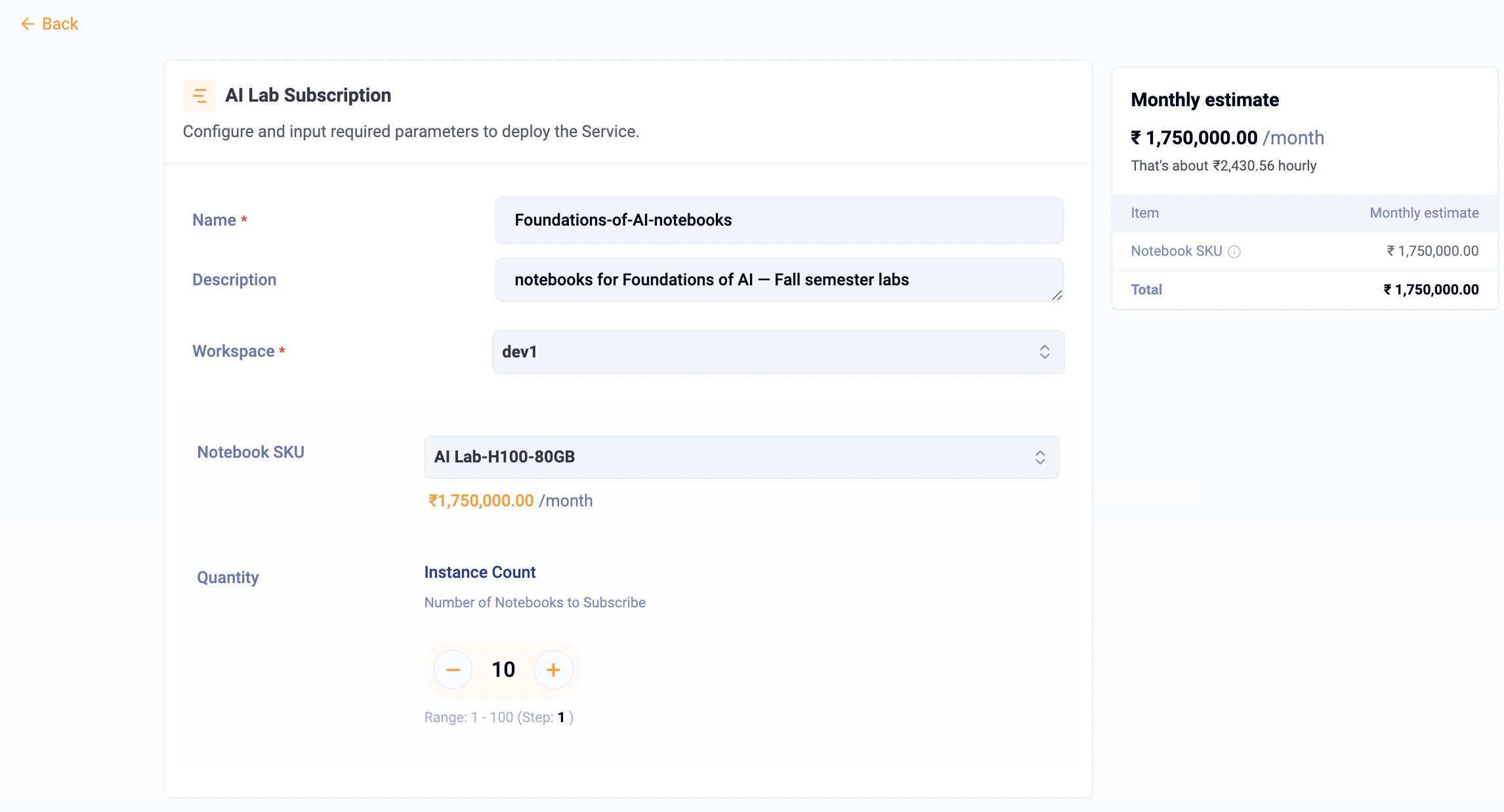 AI Lab-H100-80GBif that SKU matches the required GPU & memory profile. - Quantity: Enter the calculated number from step 2 (example: 10).