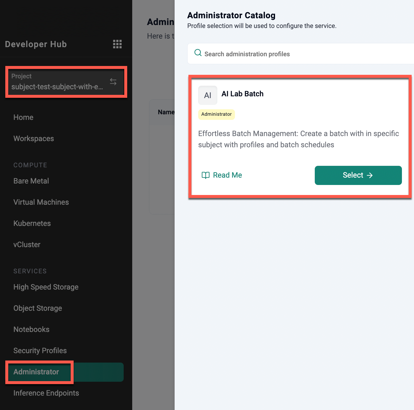 - Under Developer Hub → Administrator → New Notebook, select AI Lab Batch profile available for batch creation.