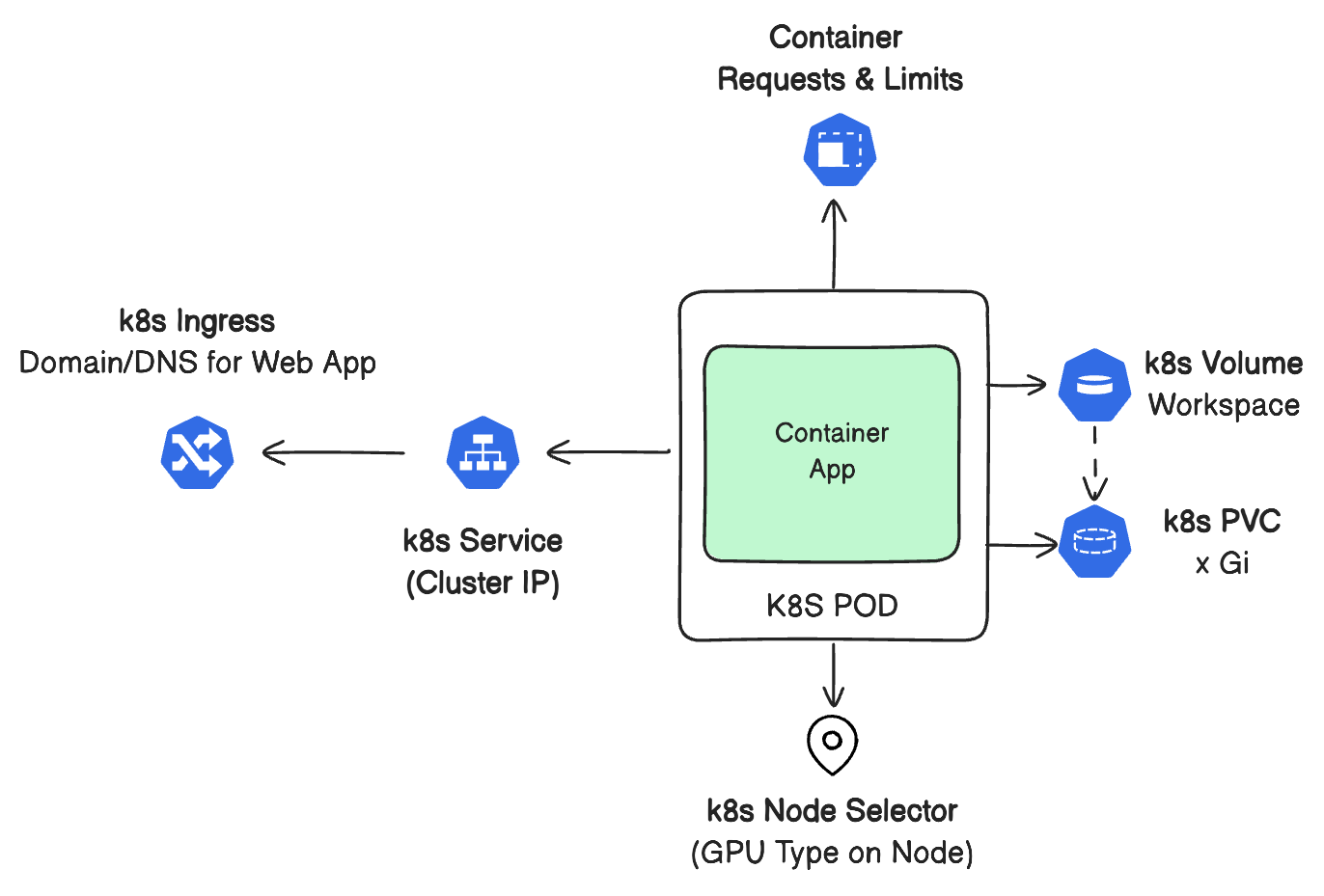 End user initiated instances of the "Docker container" based applications will be deployed on a Kubernetes cluster operating in the service provider's datacenter. These will typically be web based applications that the end users will remotely access using a web browser.