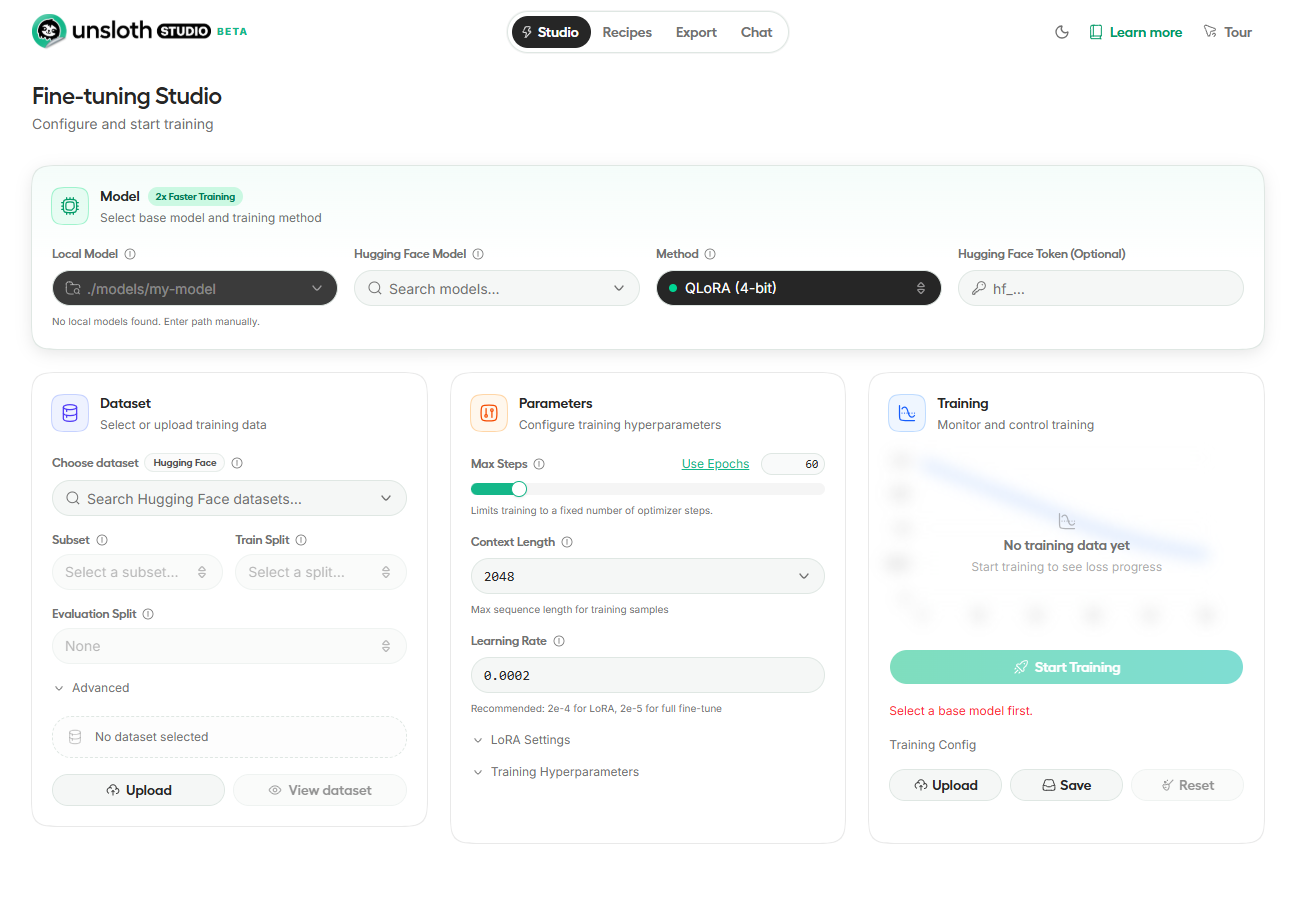 Although the docker command lists multiple ports (webapp, Jupyter notebook, ssh), we will limit user access only via the Unsloth web application.