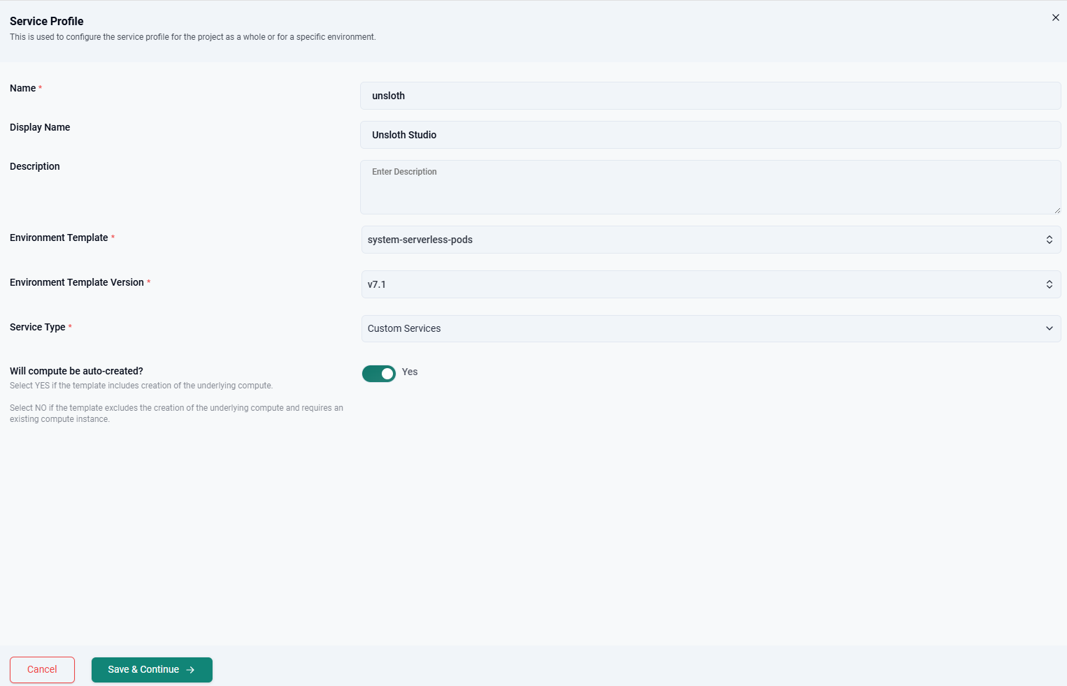 - For Environment Template, select "system-serverless-pods"