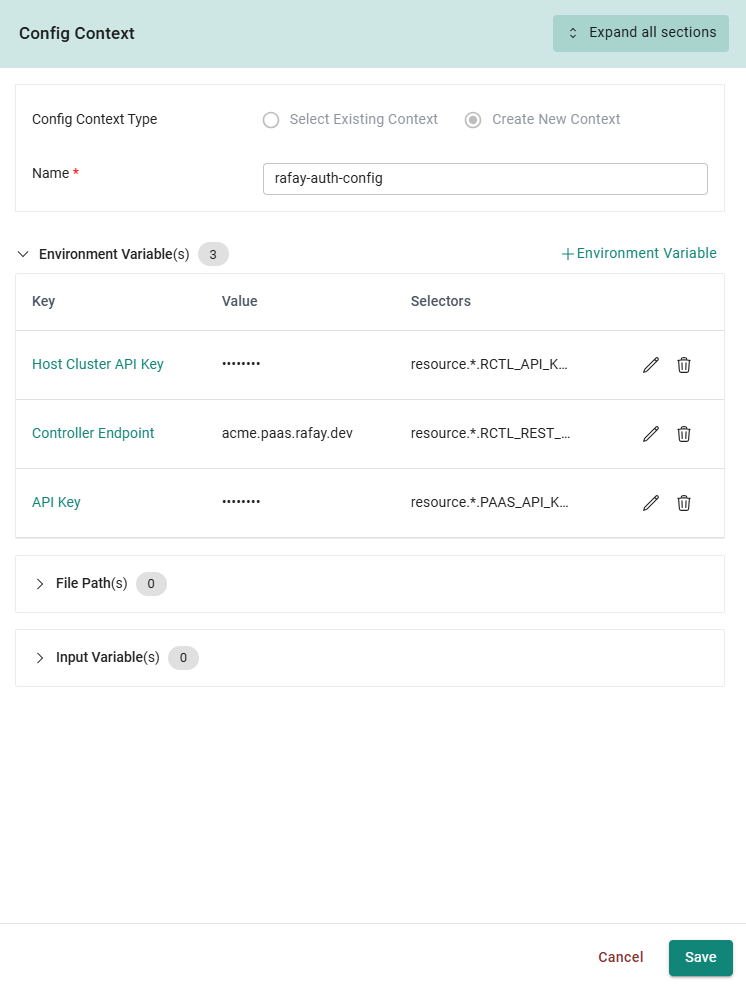 Now, you will go into the Rafay Console and update that the inline Config Context. You will then update the sensitive variable value from the console. This will then encrypt the sensitive values. The values required to populate the config context can be found in the CLI Config file which can be downloaded from Home -> My Tools -> Download CLI Config.