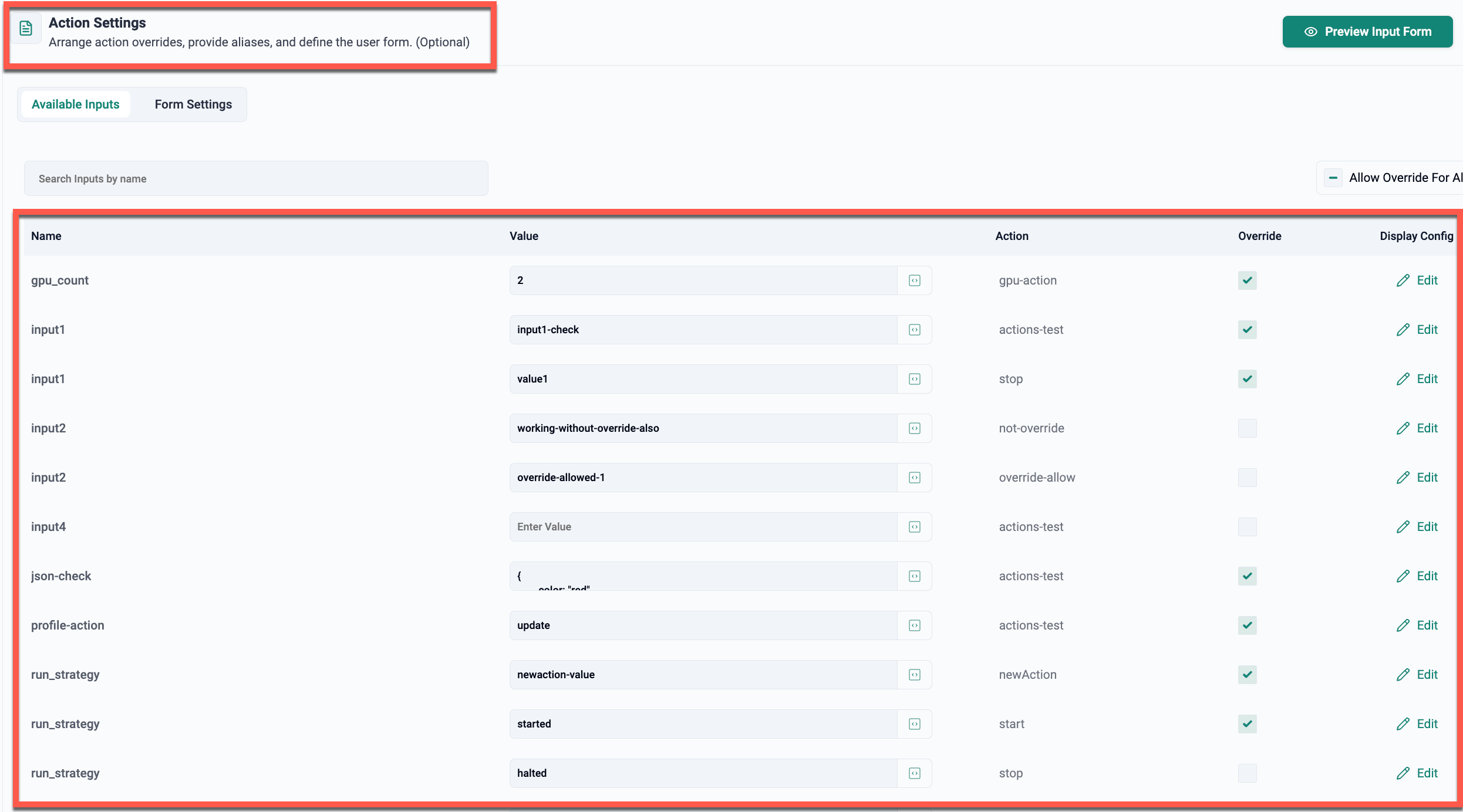 These configurations are stored per action, ensuring each action can have distinct customization based on its function and context. For example, a variable such as gpu_count with value 1 can be locked by disabling the Allow Override option, while another variable can be renamed or provided with a tooltip to enhance clarity.