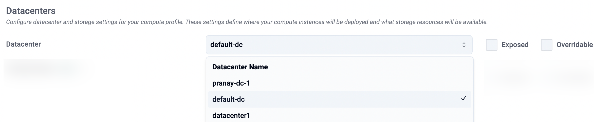 default-dcis selected by default.- Enabling Exposed makes the datacenter visible during compute instance creation.