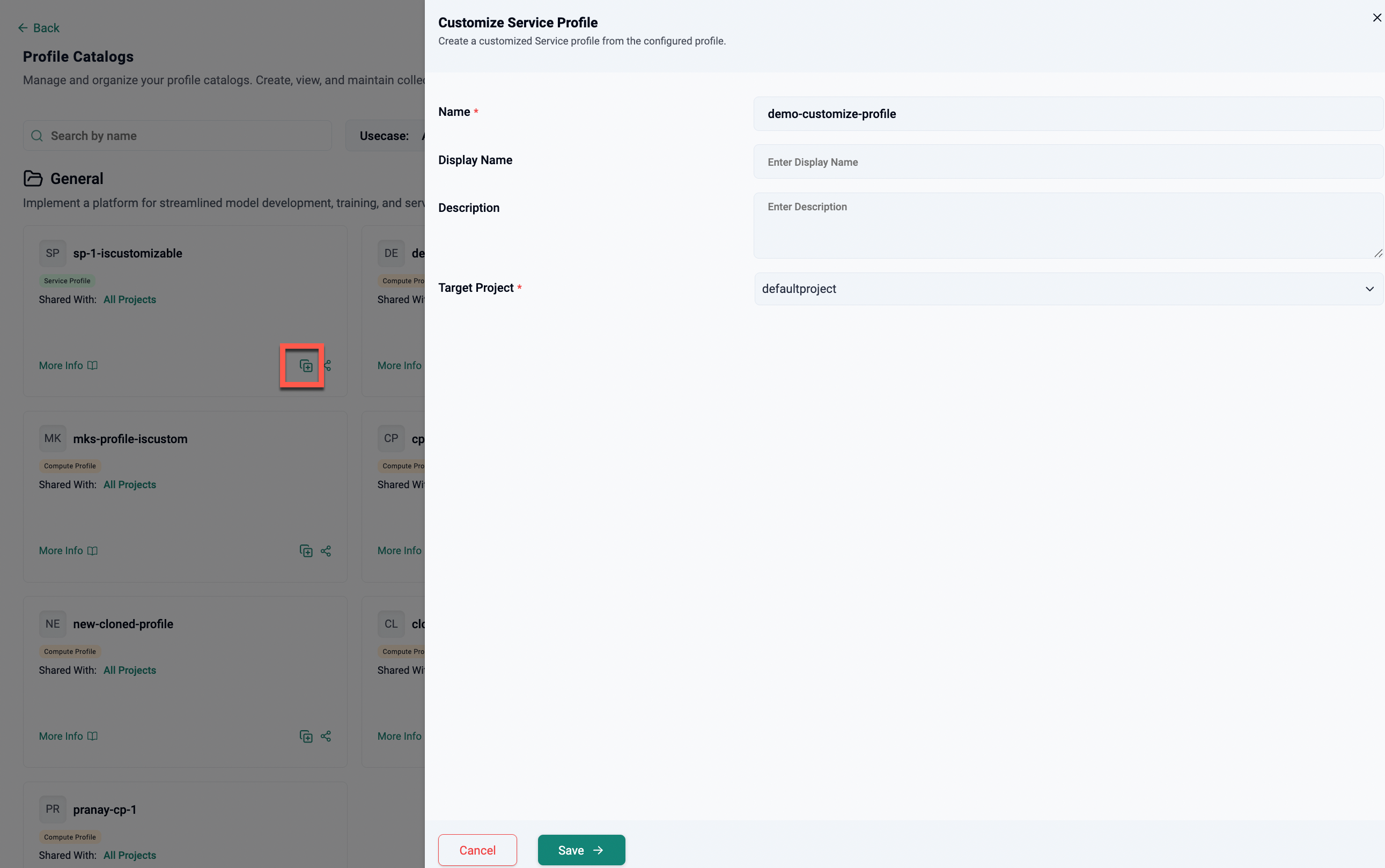 The following fields are available: * Name: Specifies the name for the customized profile. * Display Name (optional): Provides a user-friendly label for the profile. * Description (optional): Describes the purpose or variations of the customized profile. * Target Project: Indicates where the customized profile will be created within the tenant organization.