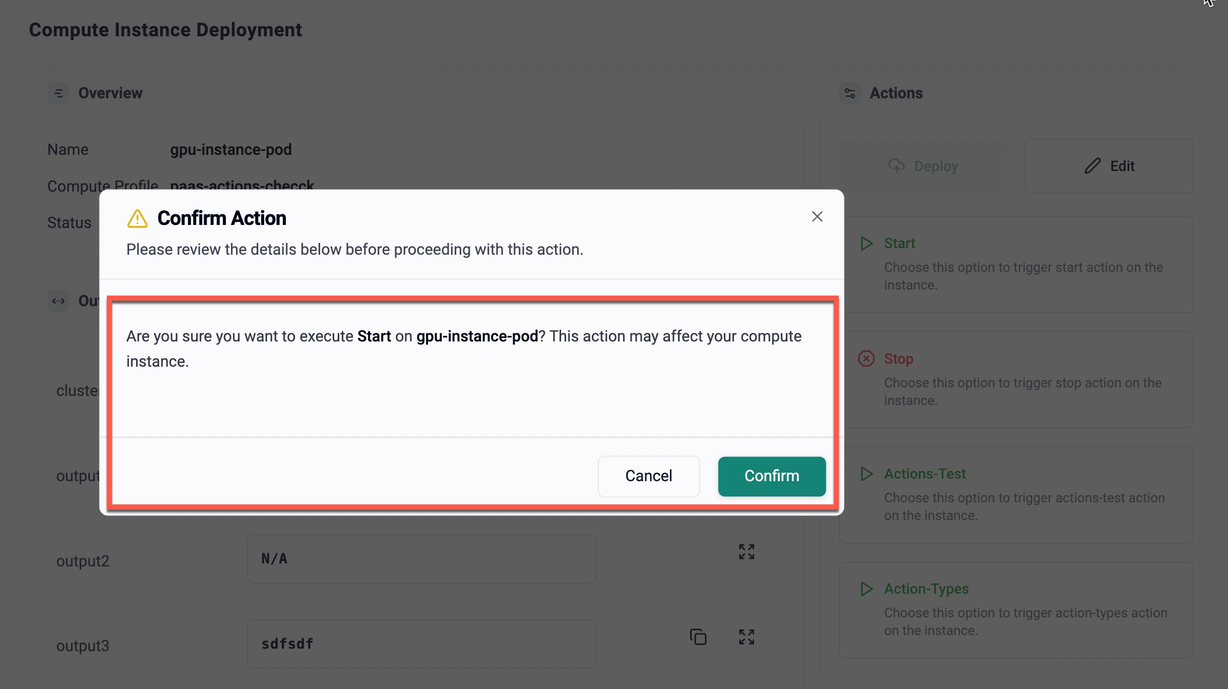 When an action is triggered, a confirmation dialog is displayed before execution. This dialog provides a final review of the selected action and the target instance to prevent unintended actions.