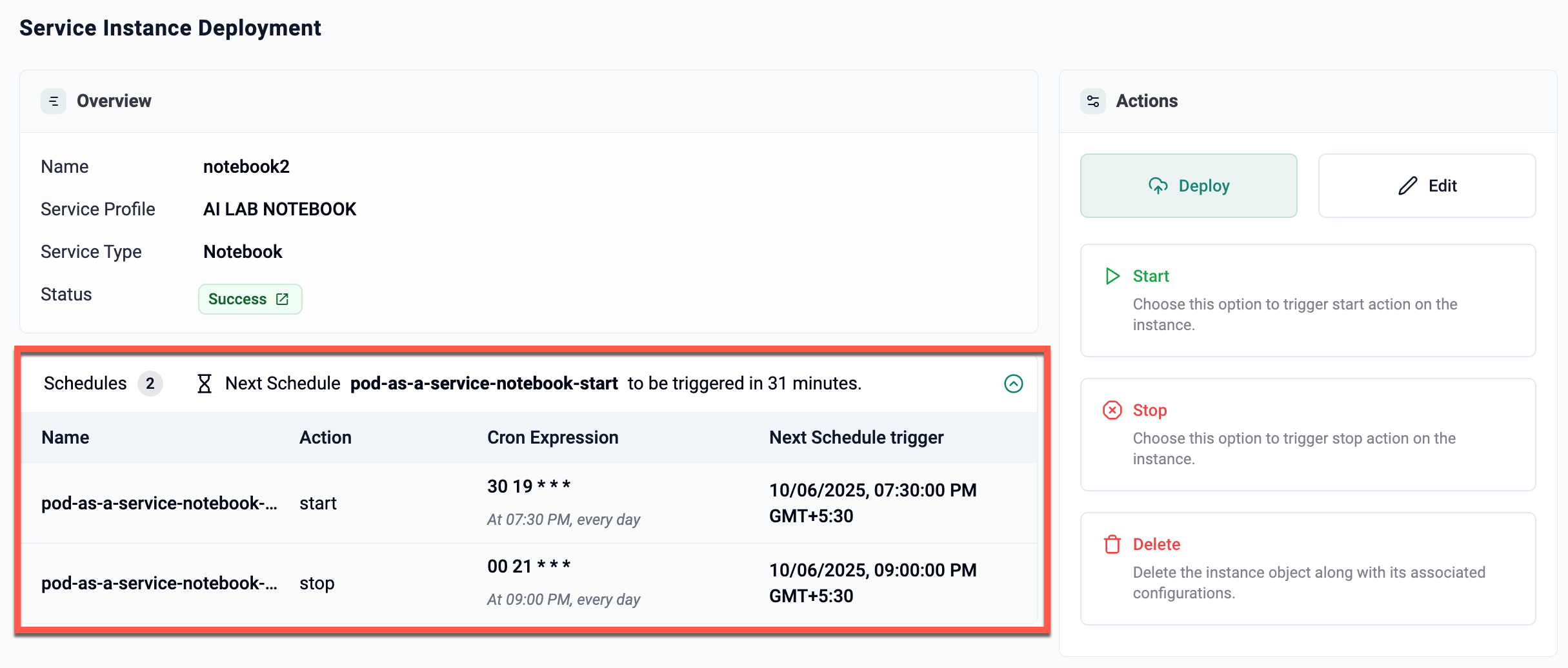 If the Service Profile used to create a service instance includes predefined schedules (for example, start and stop actions), these schedules are automatically displayed in the Service Instance Deployment view.