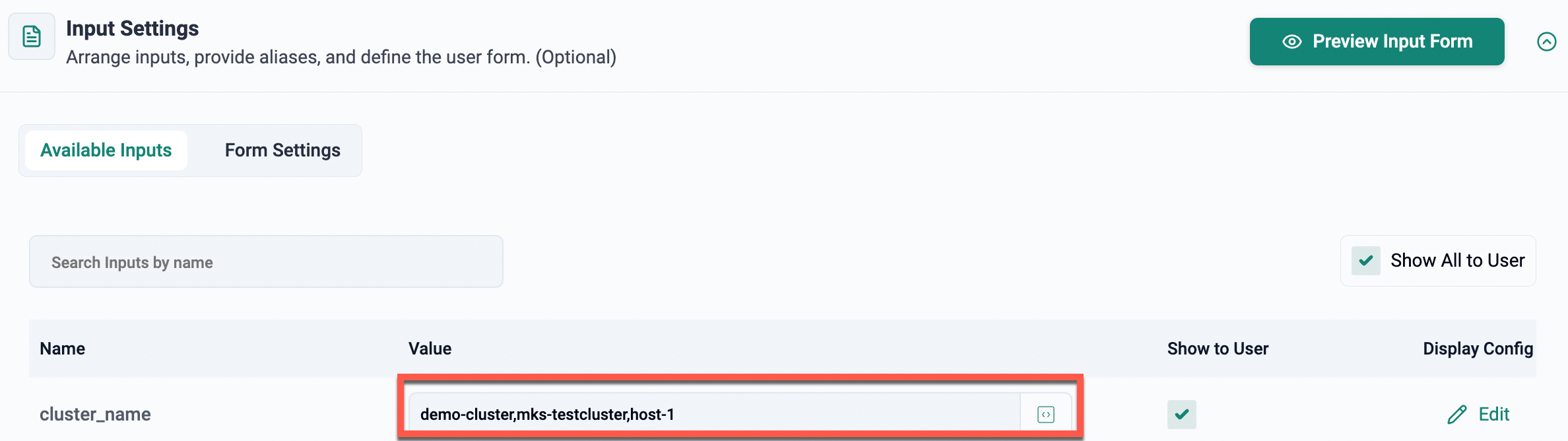 The Show to User option controls whether an input is exposed to the end user for configuration. When enabled, the input is displayed in the input form and the end user is allowed to view and override the value. When disabled, the input is not exposed to the end user, and the value is applied during execution based on the partner-defined value in the SKU. In this case, the end user cannot override the value.