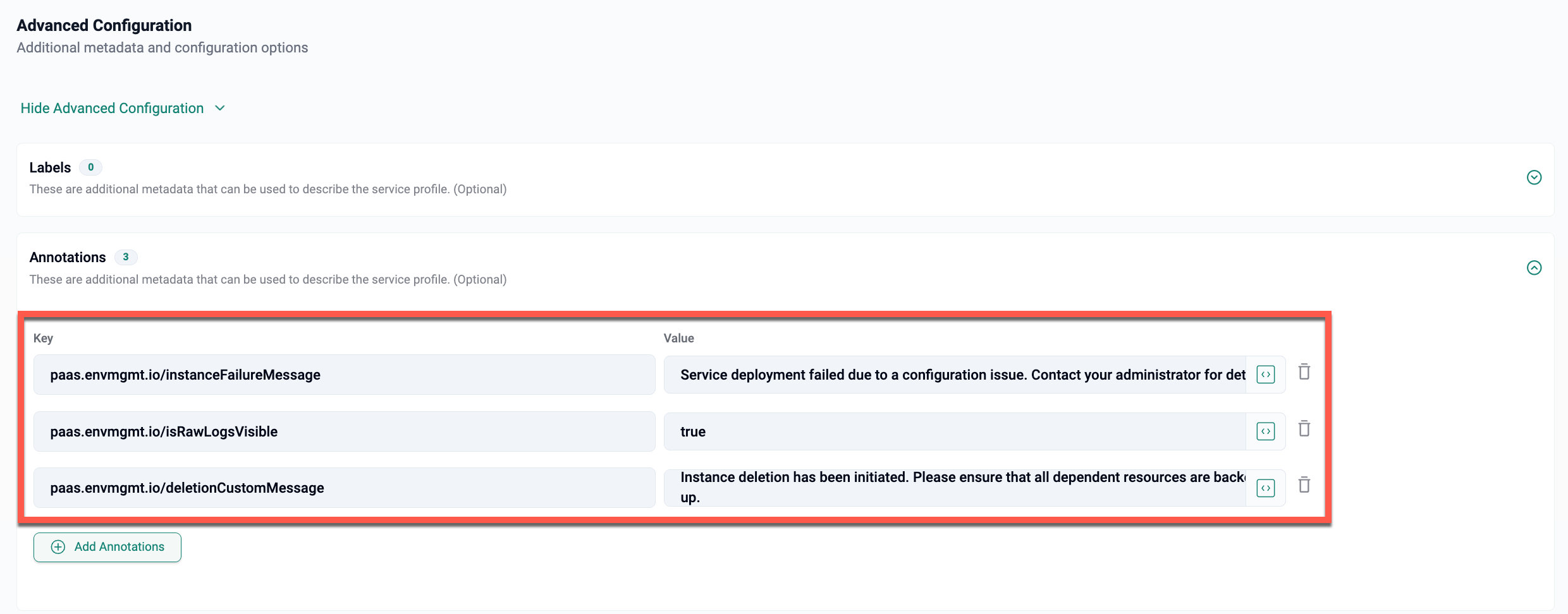 paas.envmgmt.io/instanceFailureMessage - Value: Custom message to be displayed when the service instance fails