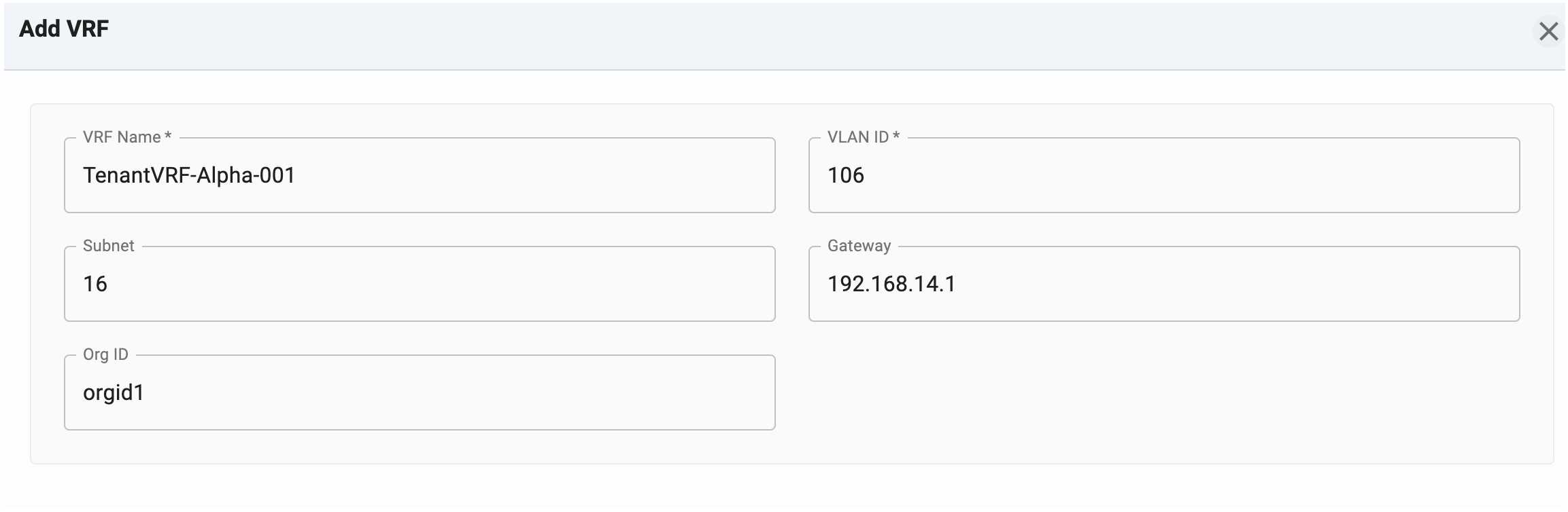 VRF Name Unique name of the VRF TenantVRF-Alpha-001
