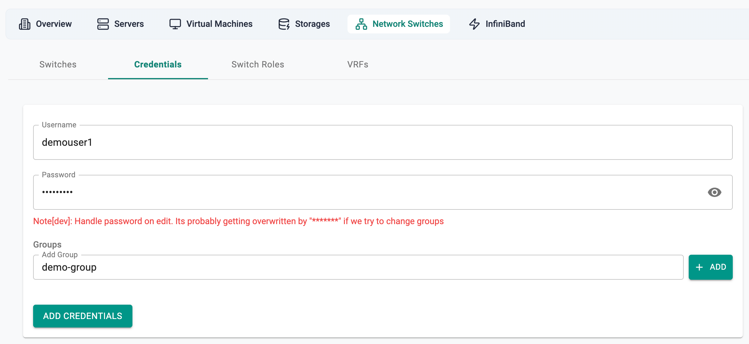 The Credentials tab allows administrators to securely store and manage login information required to access physical switches.