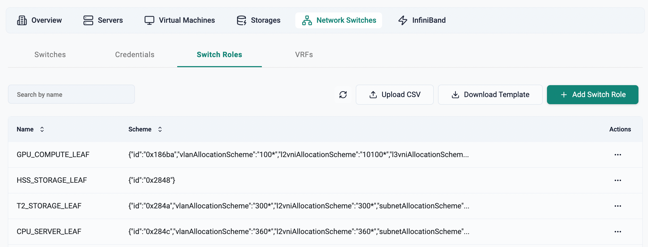 The Switch Roles tab lets administrators define reusable network schemes for switches. Each role captures settings such as VLAN/VNI ranges, subnet allocation, DHCP relay servers, and route map associations that are critical for consistent network provisioning.
