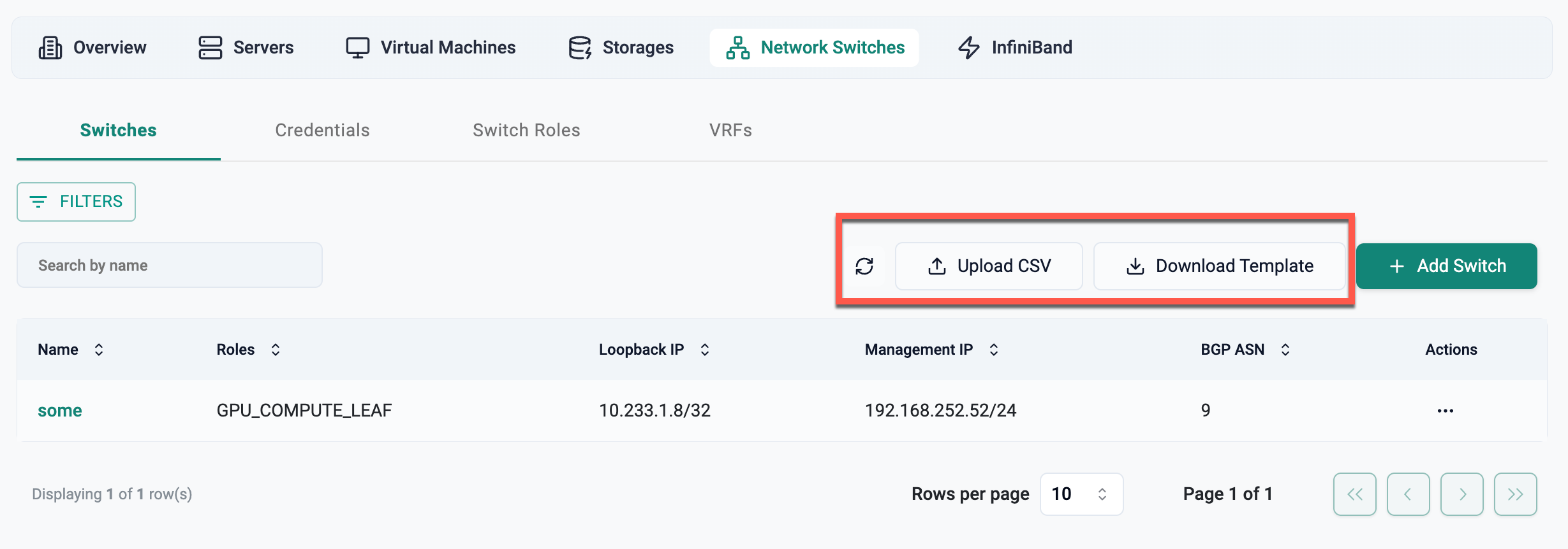 • Upload CSV: Allows bulk creation of switches using a structured CSV file. Each row represents a switch definition.