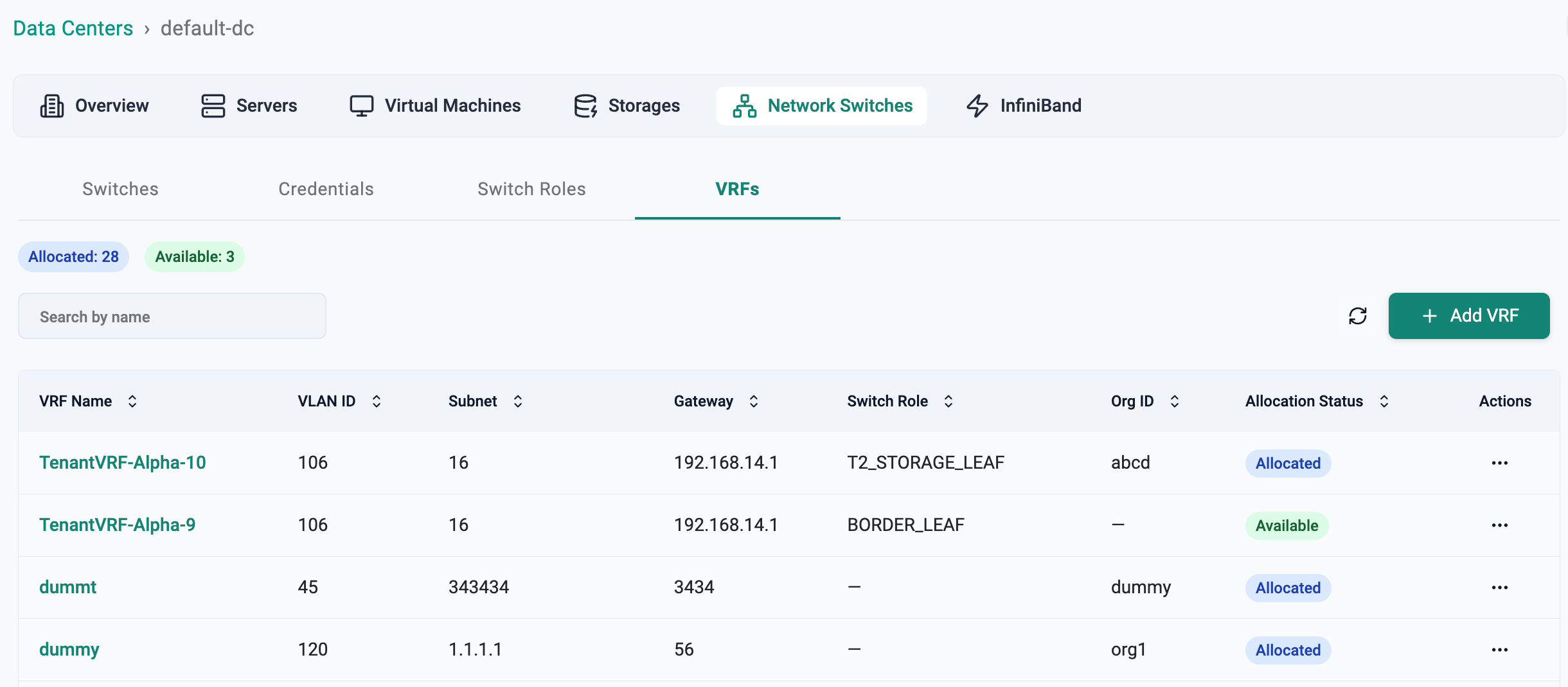 The VRFs tab lets administrators manage Virtual Routing and Forwarding instances. A VRF defines isolated network paths within the same switch fabric, allowing multiple tenants or applications to use overlapping IP spaces without conflict.