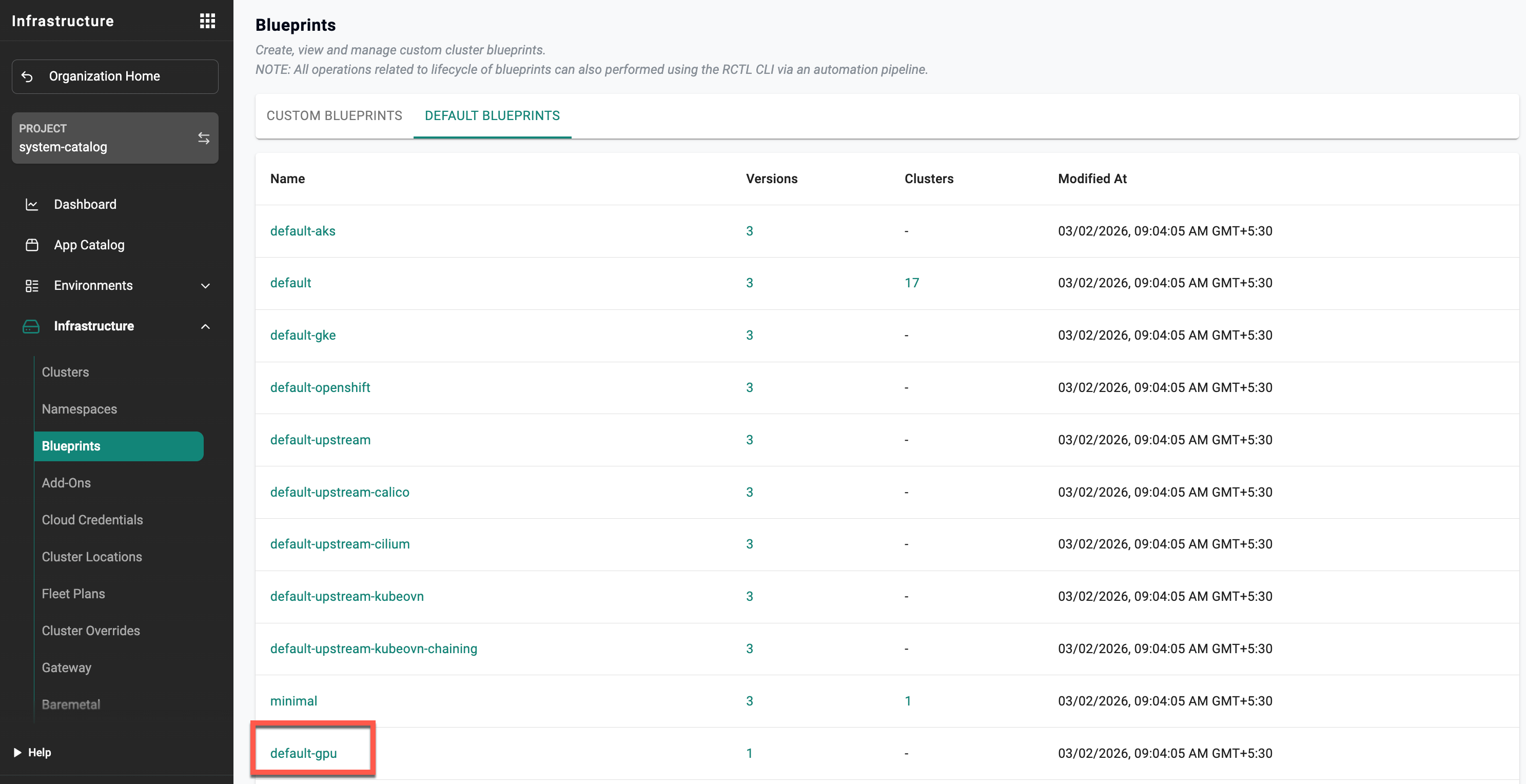 The default-gpu blueprint located in the system-catalog project of the default organization acts as the centralized blueprint that can be used during compute and service instance launch across organizations.