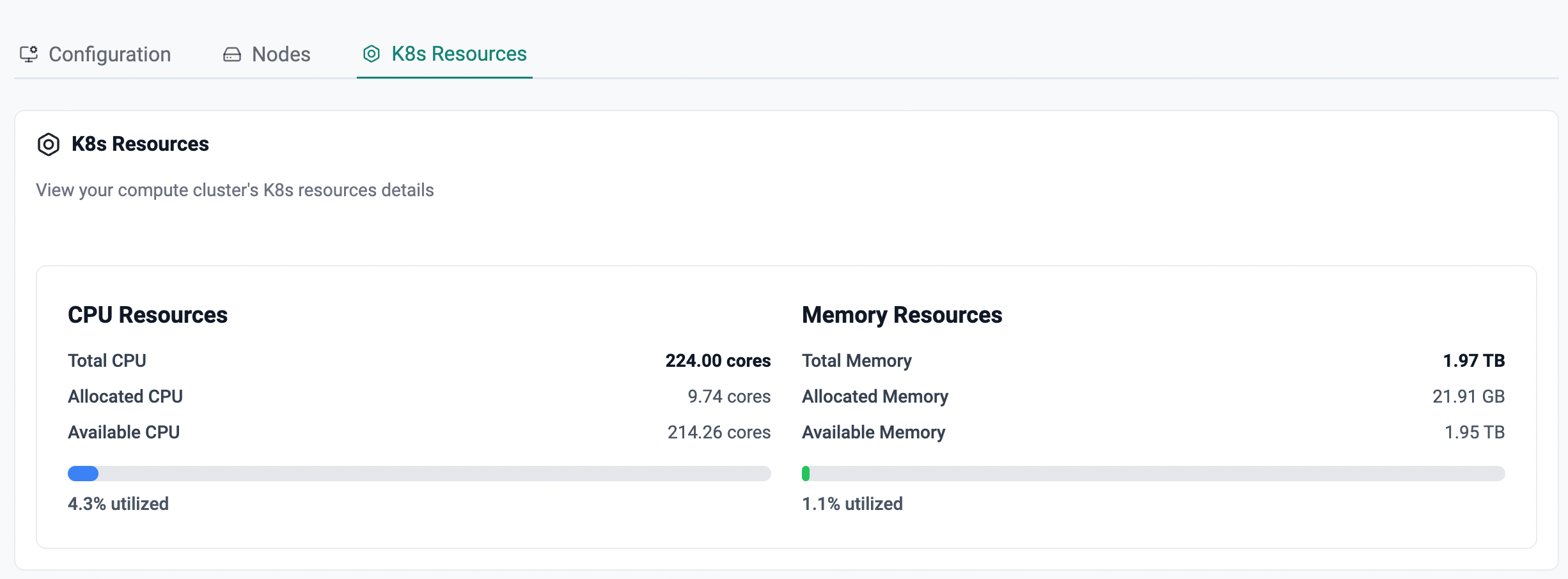 The K8s Resources view reflects the combined resource consumption across all nodes in the compute cluster and provides a high-level snapshot of cluster capacity. This information helps assess overall resource availability for current and future model deployments.