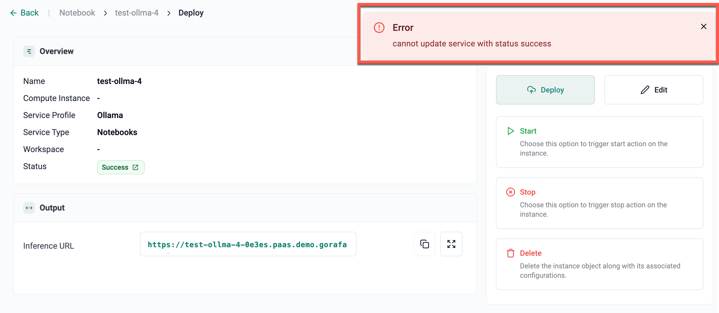 Users may notice they cannot update a service to capture new configuration changes if the service status is Success. For example, if configuration values are updated in PaaS Studio and a redeployment is attempted, the process fails with a message indicating that services with a Success status cannot be updated.