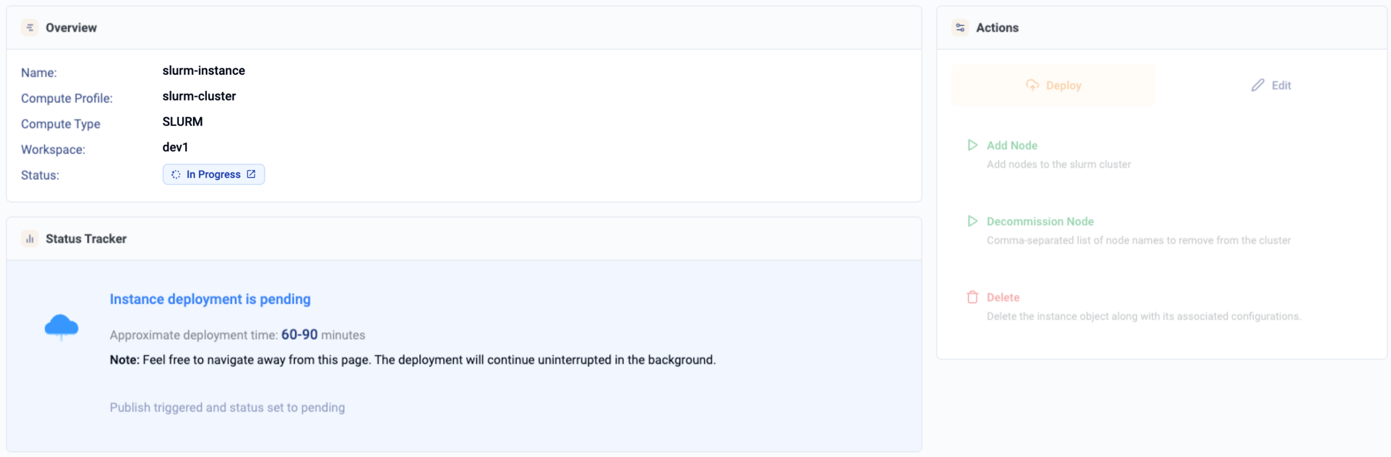 The platform automatically provisions the requested nodes and registers them with the SLURM cluster. Once added, these nodes become available for scheduling workloads.