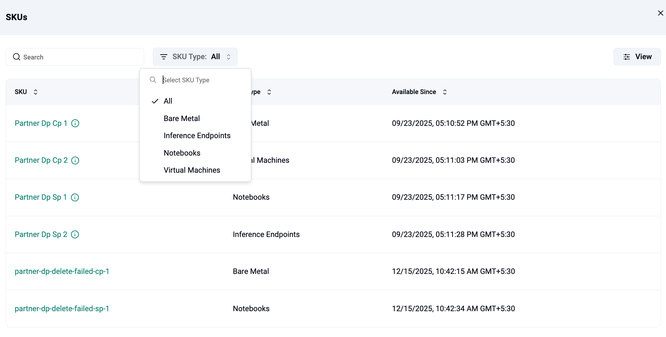 Each SKU entry includes: - SKU: Name of the SKU - SKU Type: Category associated with the SKU, such as Bare Metal, Virtual Machines, Notebooks, or Inference Endpoints - Available Since: Timestamp indicating when the SKU became available