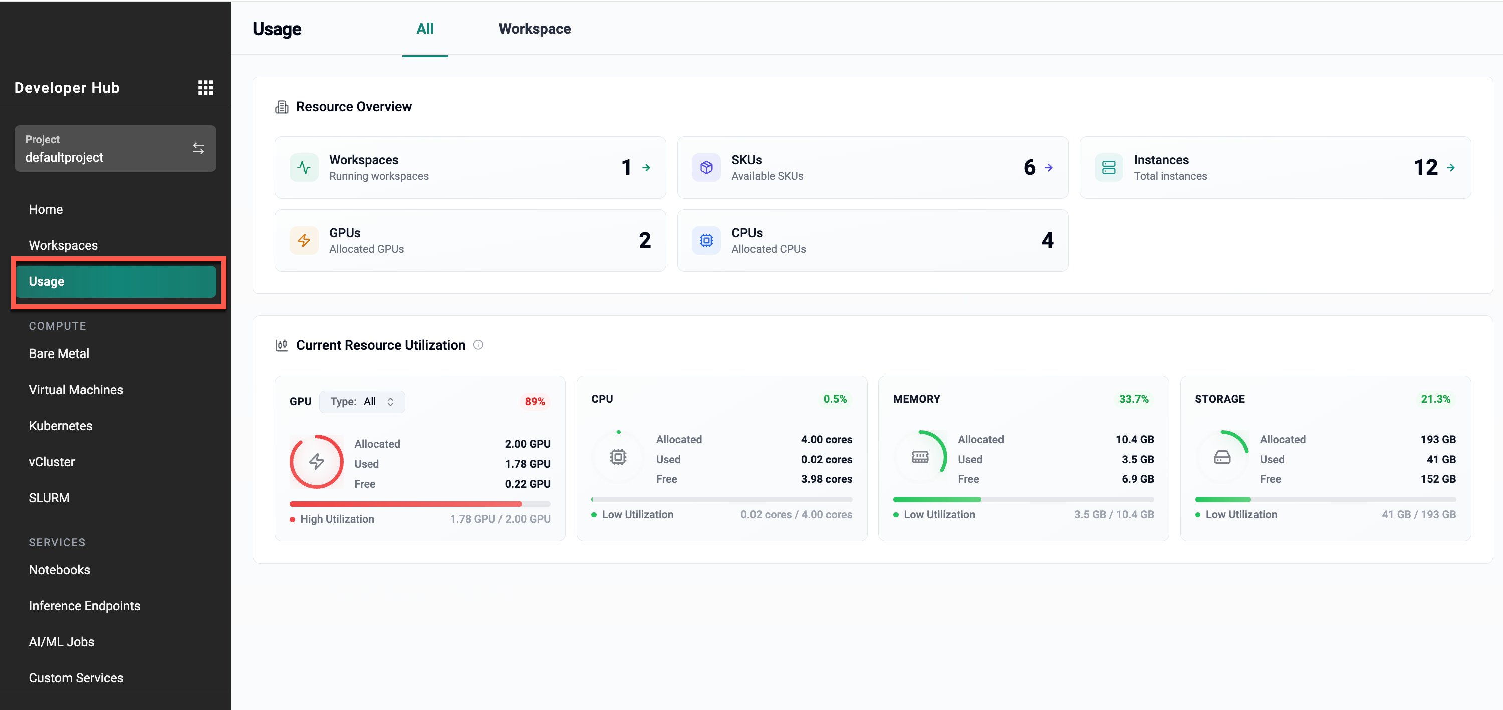 The Resource Overview section includes: - SKUs – Available SKUs associated with project-scoped instances - Instances – Total project-scoped instances - GPUs – Allocated GPUs for active project-scoped instances - CPUs – Allocated CPU cores for active project-scoped instances