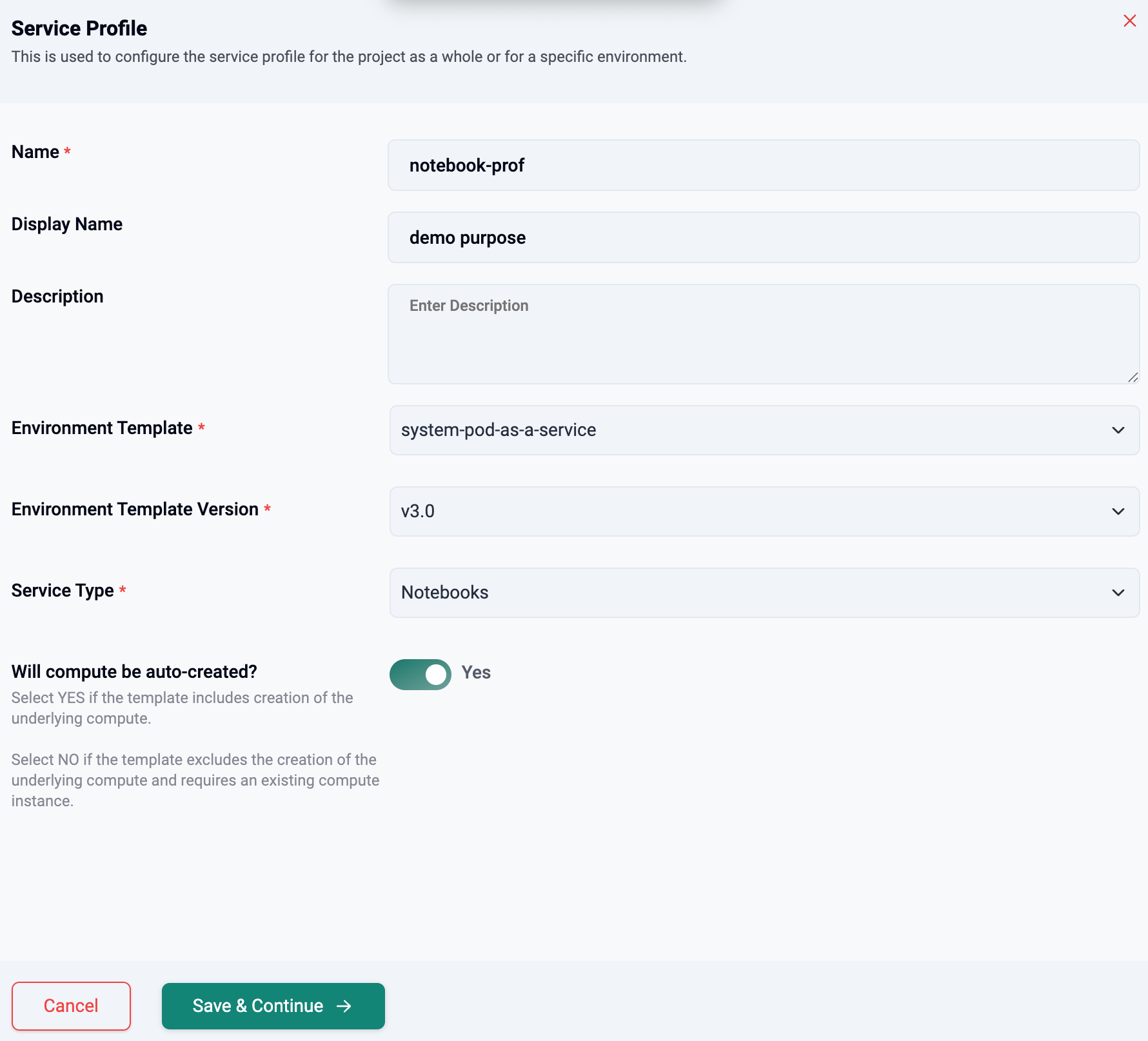 Once the changes are saved, the notebook service profile becomes available in the Developer Hub. End users can select this profile and deploy a Notebook. For the detailed process flow, see User Workflow for Notebook Services