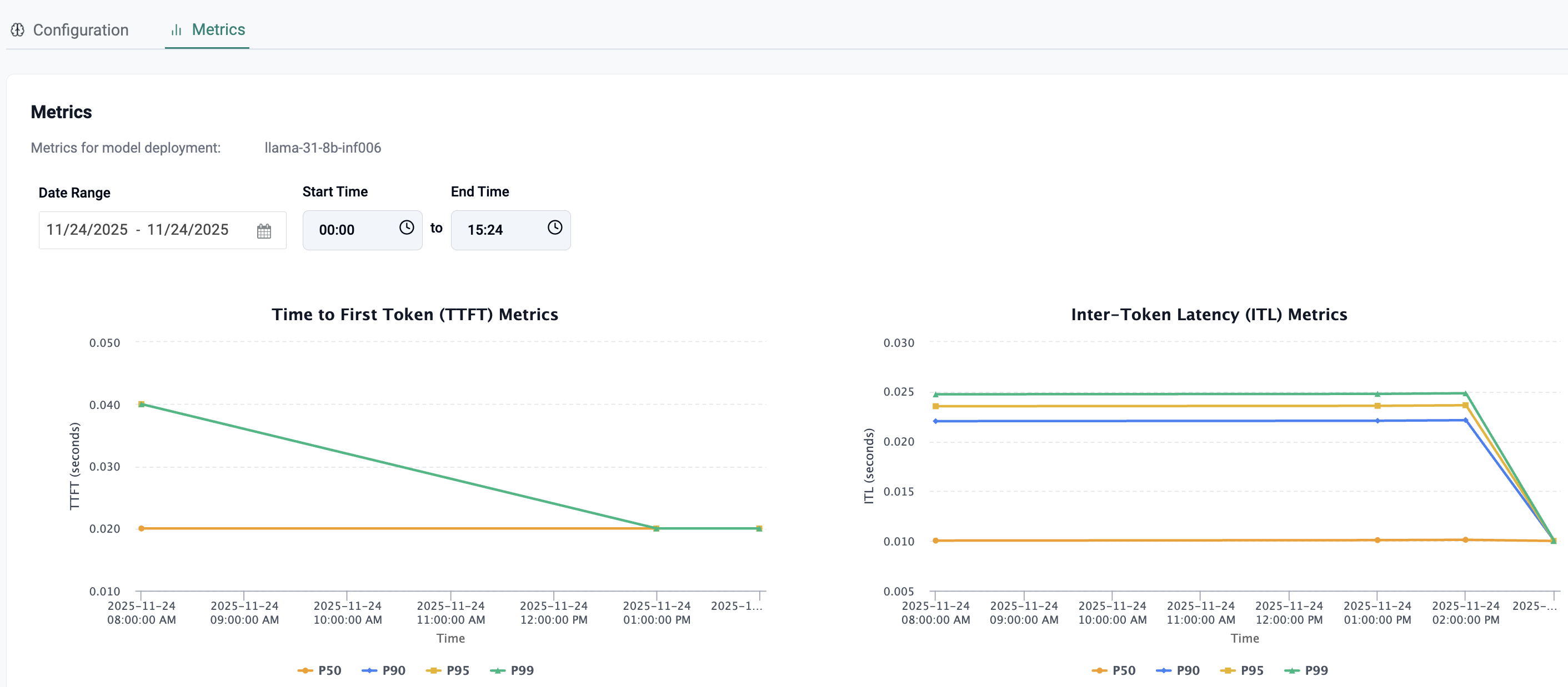 For a given model deployment, model metrics are aggregated and available to the administrator. The metrics are continuously aggregated, but calculated every 60 minutes. So, the data points are available for 1hr time periods