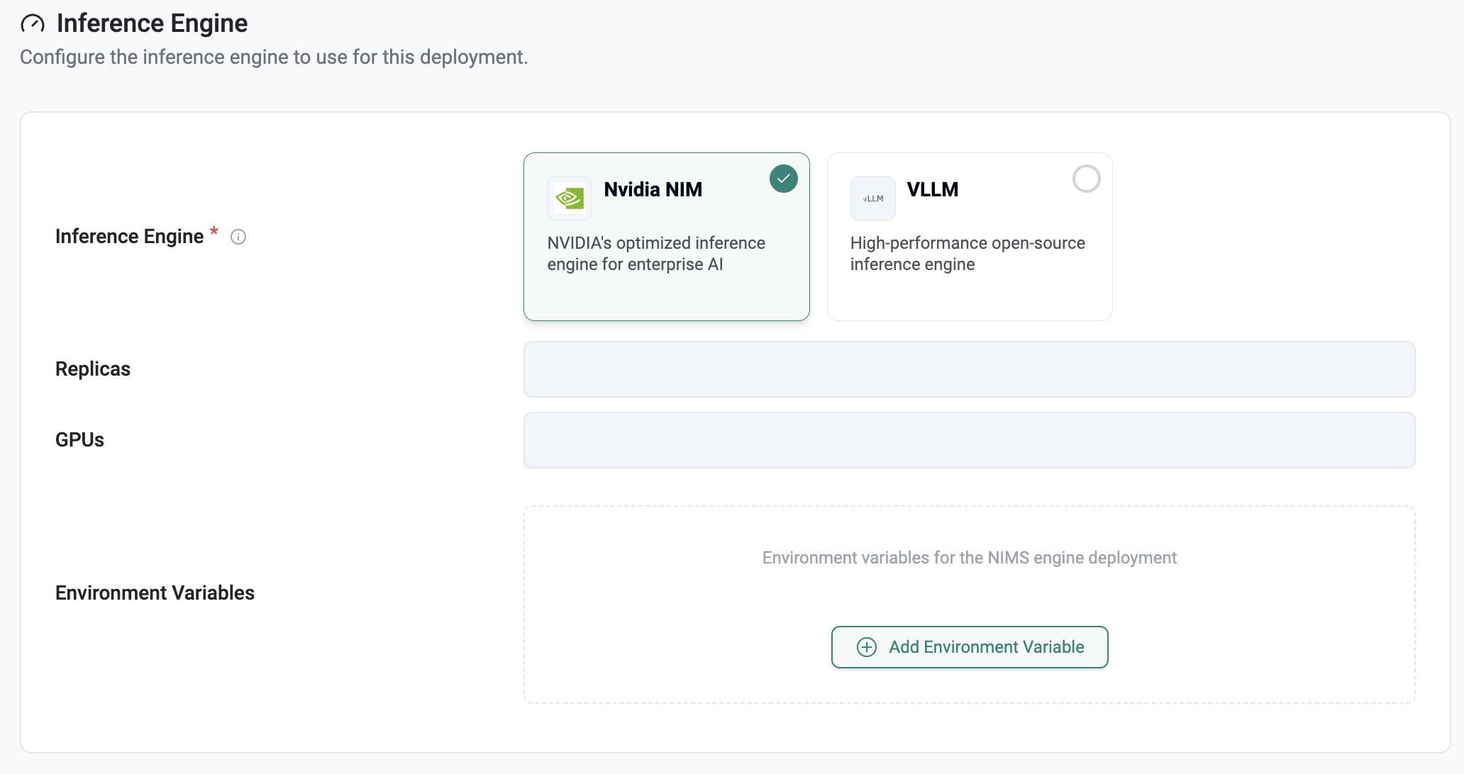 In this step, the admin has to select their preferred Inference engine. Three options are available: vLLM, NIM and Nvidia Dynamo. The default engine is vLLM.