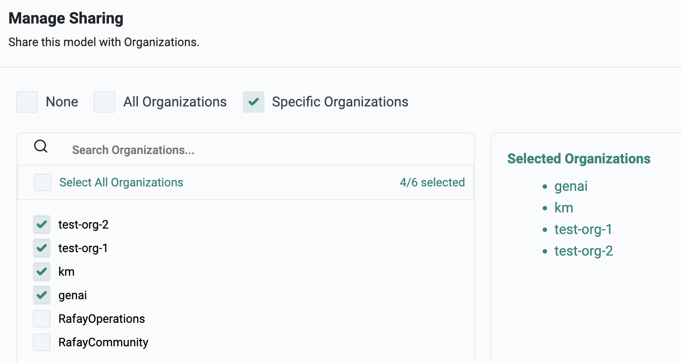• Select "Select Orgs" to make the model available to selected tenant orgs.