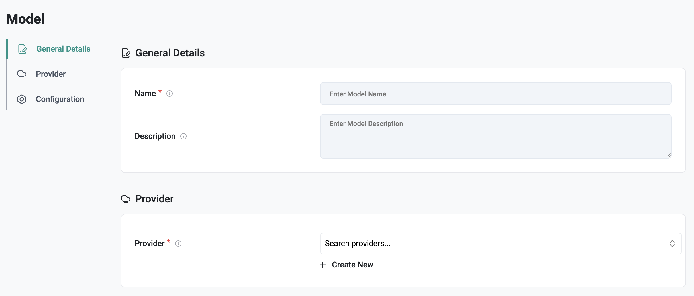 Select from the dropdown list of existing providers. Admins can also click on "Create New" to navigate to the workflow to create a new provider.