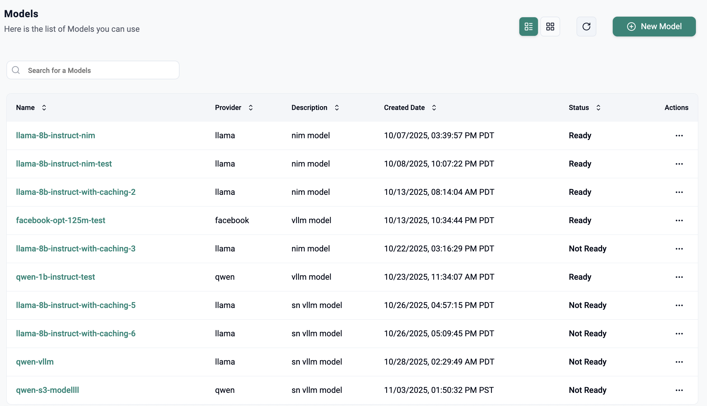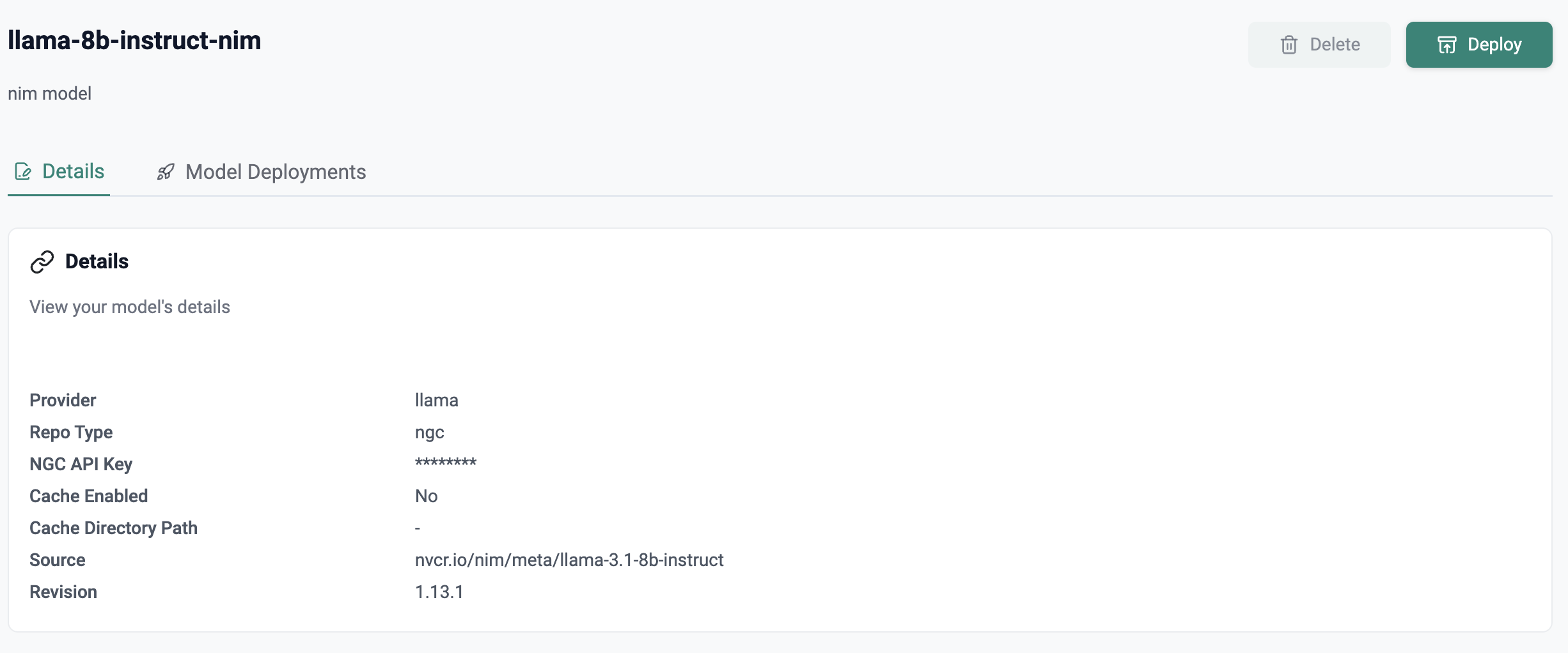 In the Ops Console, click on a selected model to view details. Shown below is an example of a "Llama 3.1-8b Instruct" model powered by the "NIM" Inference engine.