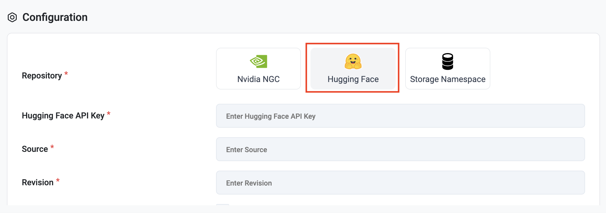 When this option is selected, the model weights and related information is downloaded during deployment from Hugging Face. You need to provide the following details in order for the Rafay Platform to access Huggingface.