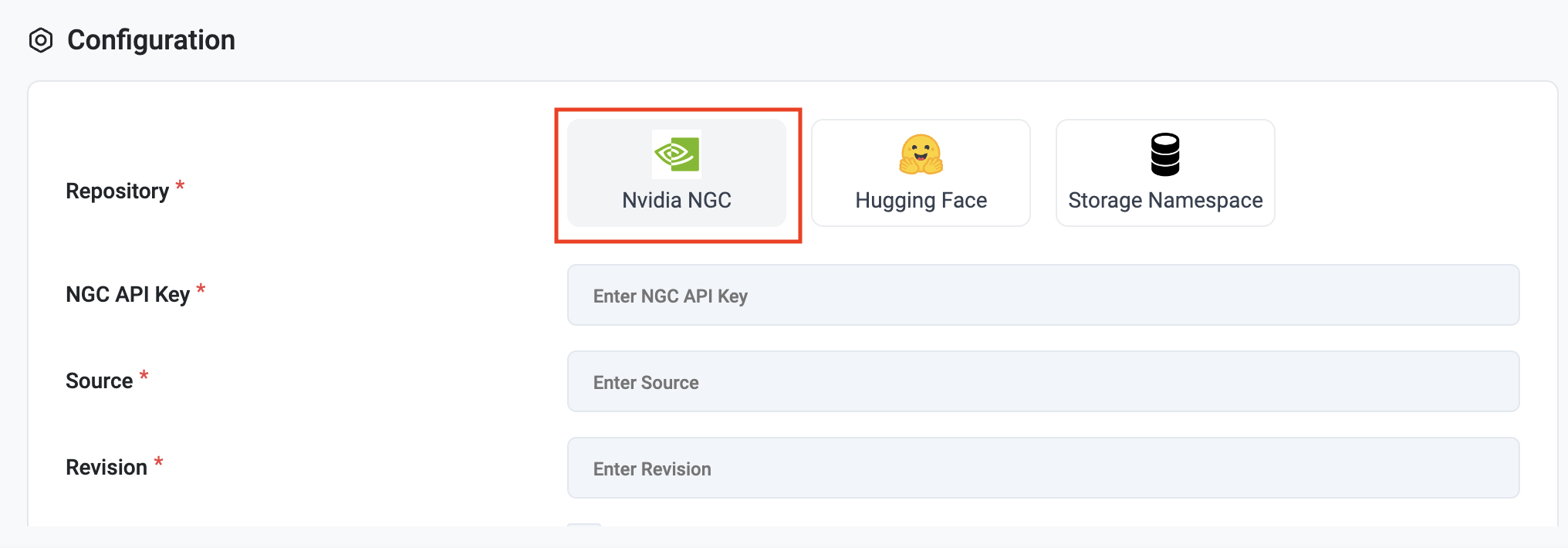 When this option is selected, the model weights and related information is downloaded during deployment from Nvidia's NGC Catalog. You need to provide the following details in order for the Rafay Platform to access NGC