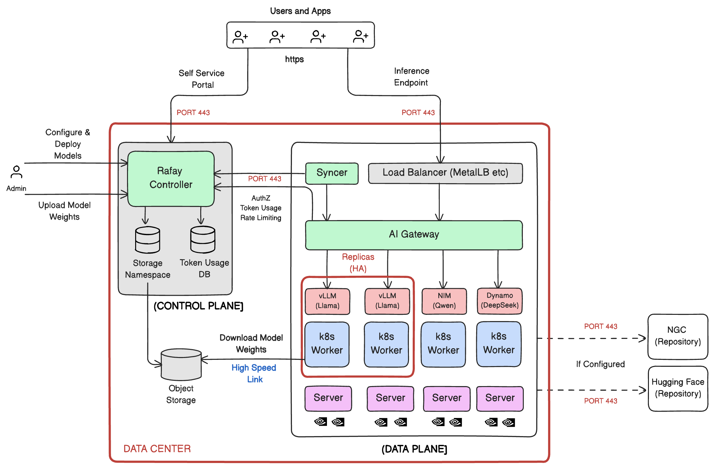 The data plane is where the actual inference requests from users are handled and processed. This will be a number of GPU servers running in a datacenter. We will deploy Rafay MKS (Upstream Kubernetes) on the servers and will act as the substrate for the data plane software components of the Serverless Inference solution.