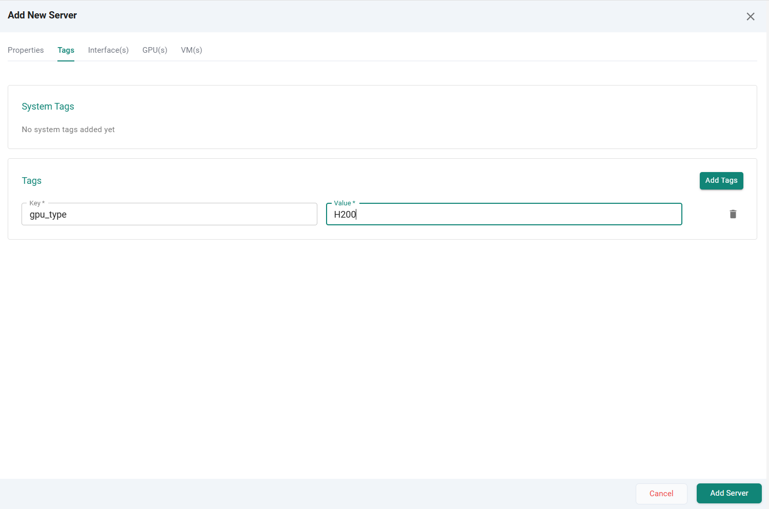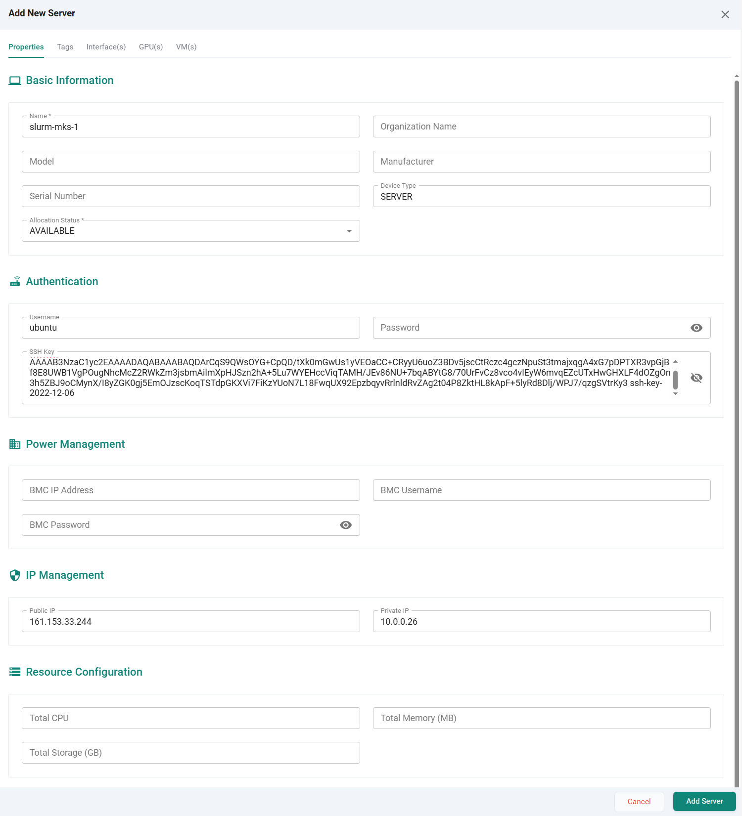 - Optionally you can add a tag with the key public_ip if the IP to access the SLURM nodes will be different than the server SSH management IP. This IP address will be used as the public IP address used to access the SLURM nodes. SSH access to the underlying server will still use the public IP address set previously in the IP Management section.