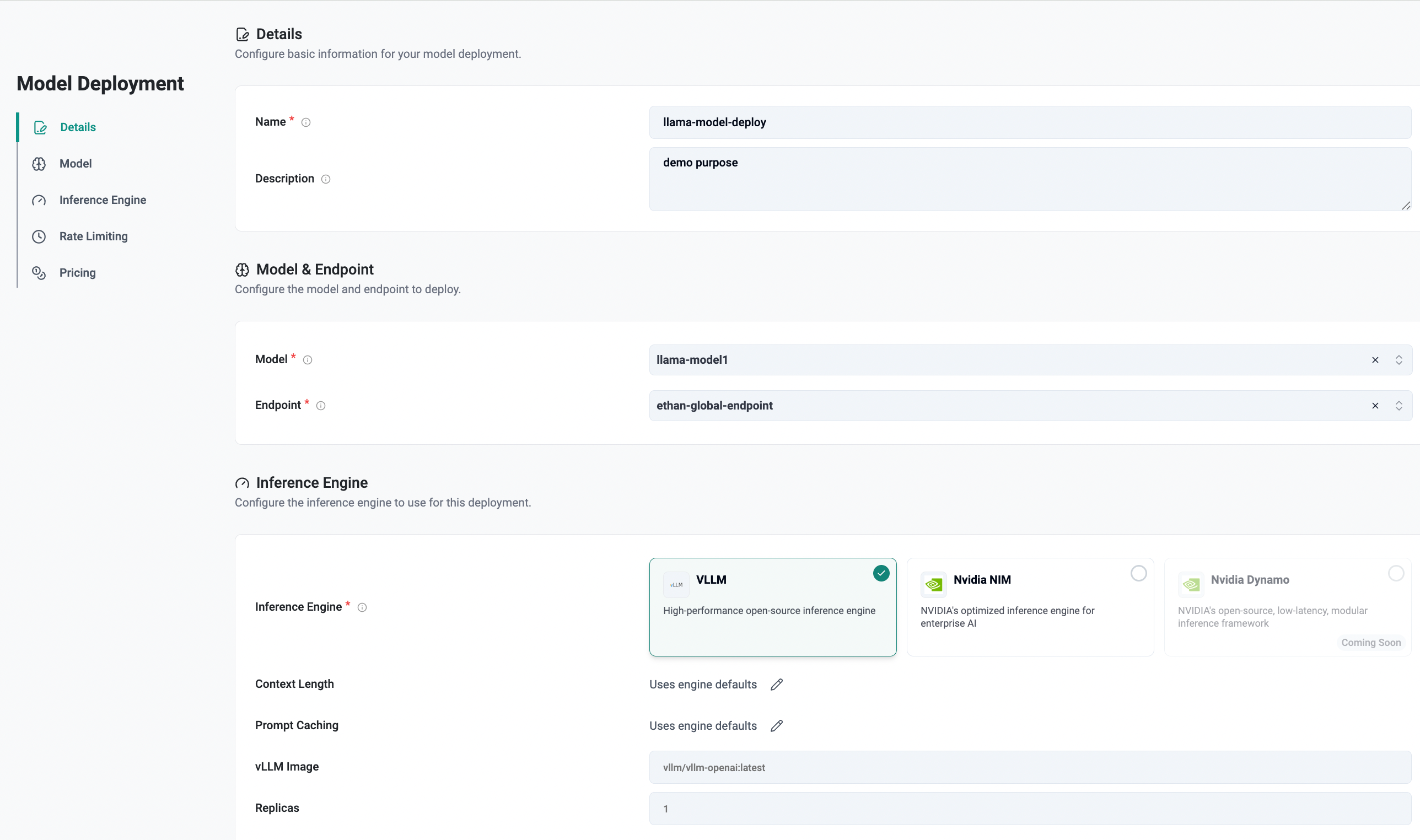 The Inference Engine section defines how the model is executed at runtime and controls performance, scalability, and resource usage for the deployment.