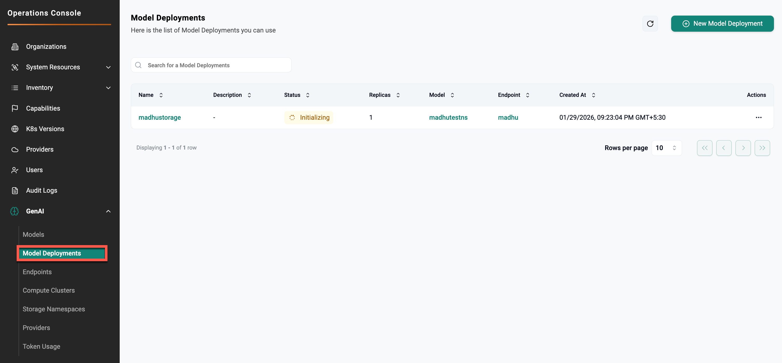 This view lists all model deployments across the system and is used for centralized deployment management and monitoring.