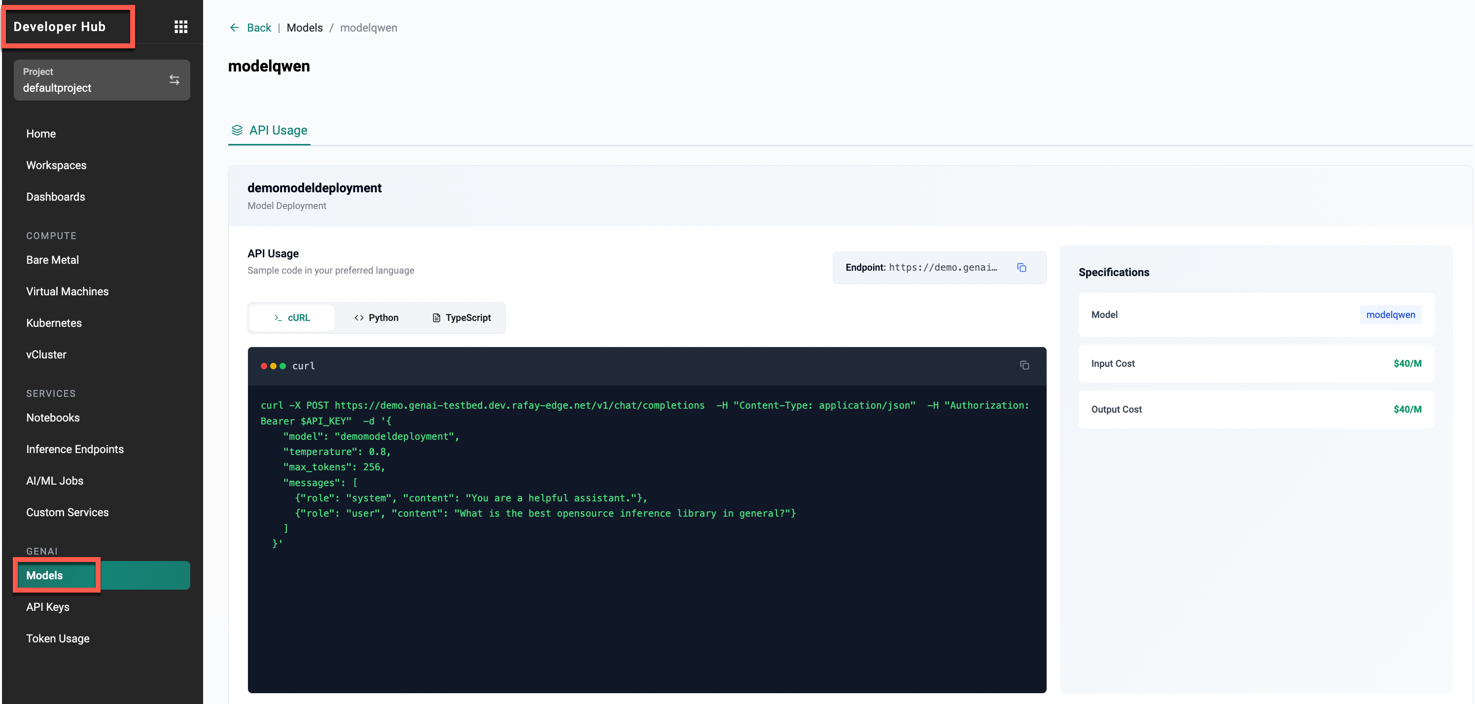 1. Navigate to Developer Hub → GenAI → Models