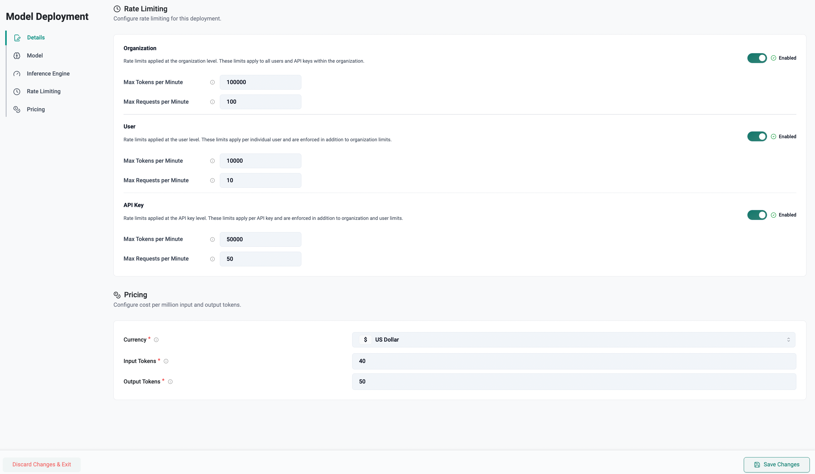 The Rate Limiting section defines request and token usage limits for the model deployment. Limits can be configured at multiple levels to control traffic and usage.