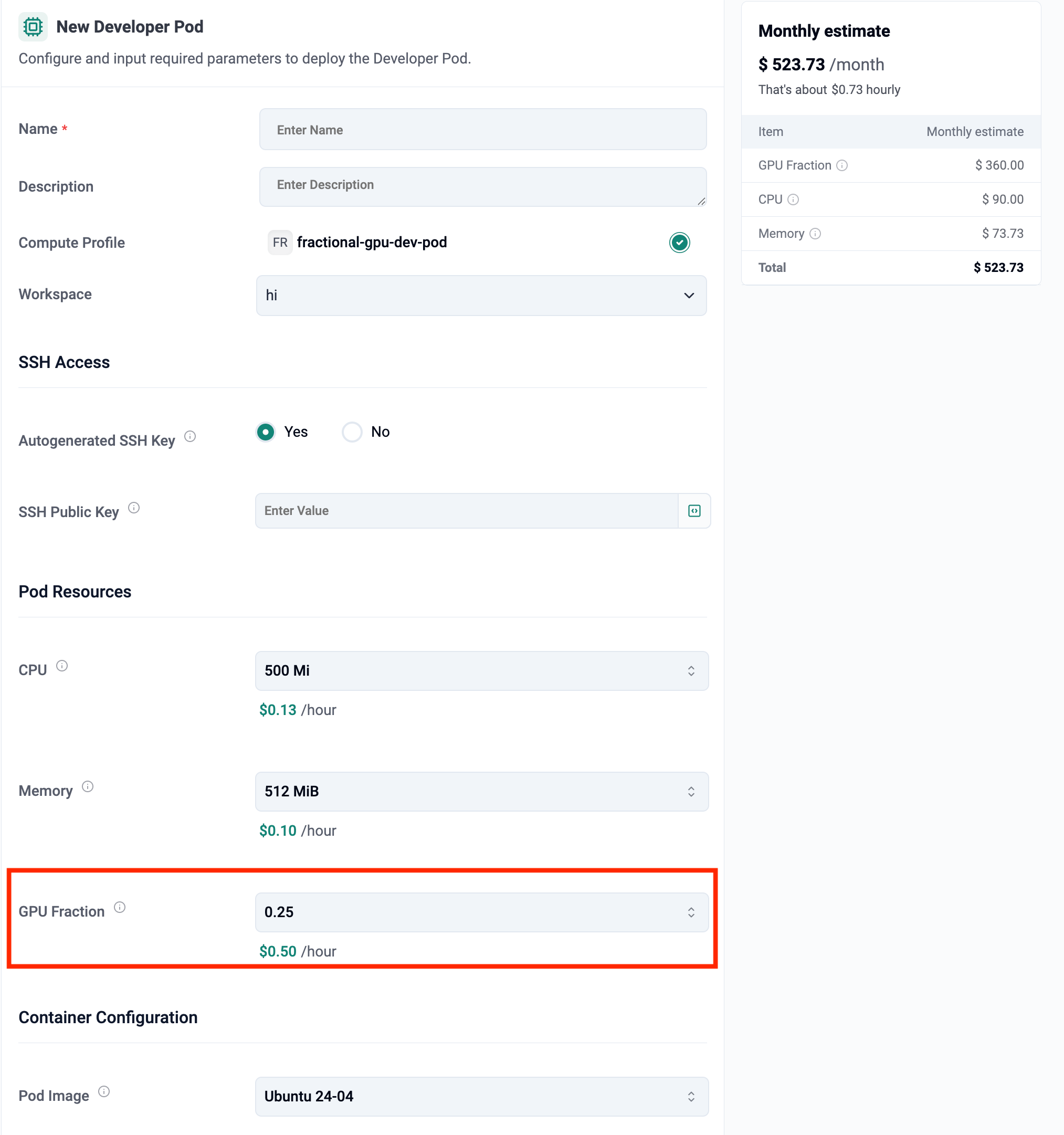 - GPU Fraction: e.g., 0.25 ($0.50/hour)