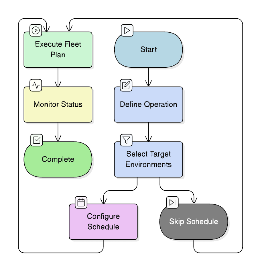 The Fleet Plan configuration flow guides you through defining operations, selecting target environments, optionally scheduling execution, and monitoring the results. This visual workflow ensures a systematic approach to managing environments at scale.