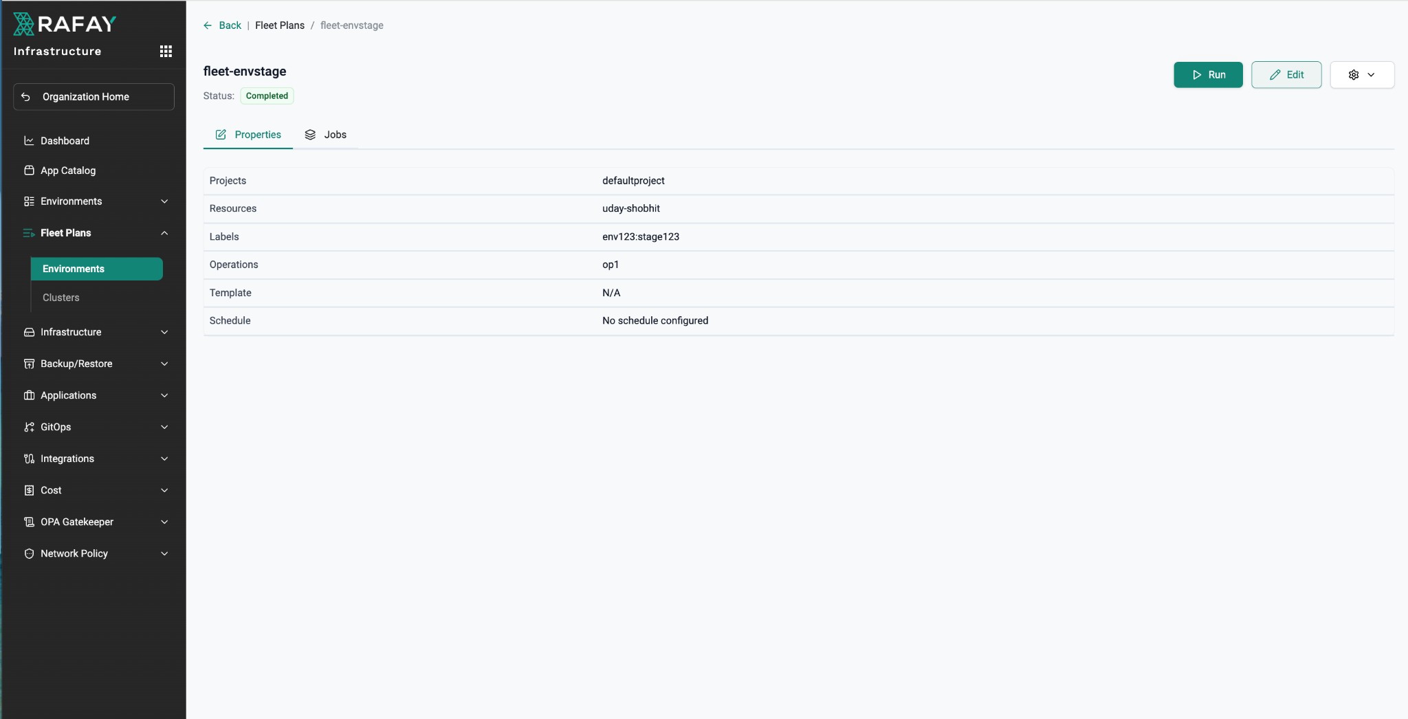 After configuration, the Fleet Plan properties view displays all settings including projects, resources, labels, and operations. This example shows a completed fleet plan with its targeting criteria clearly defined.