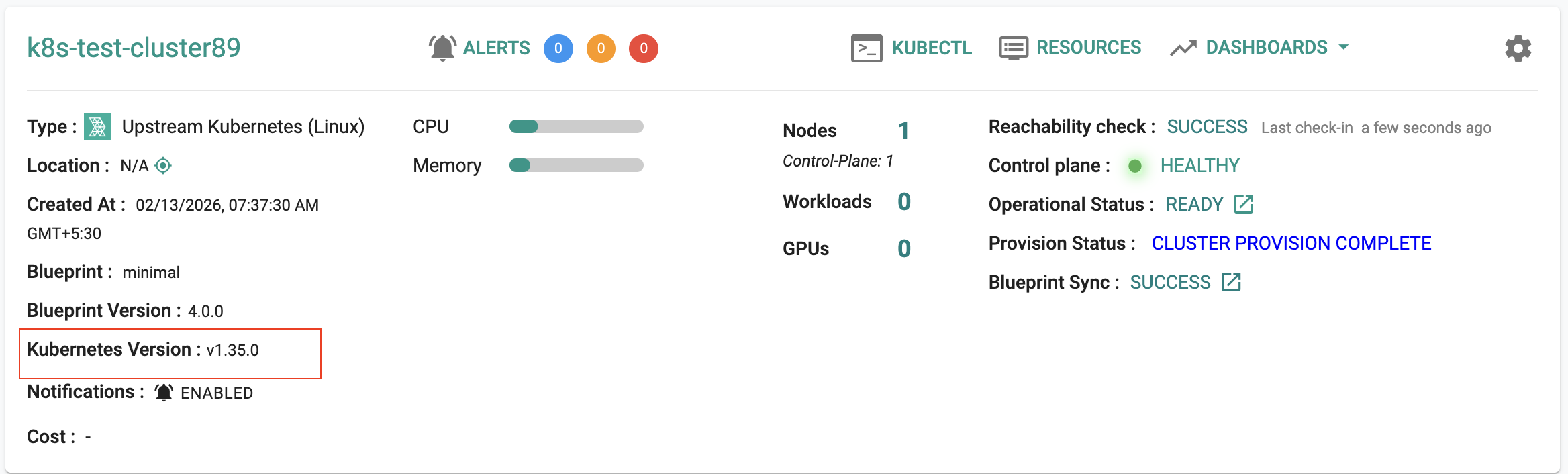 - Clusters running on older platform versions will not be eligible for the Kubernetes v1.35 upgrade until Platform Version 1.2.0 is applied.