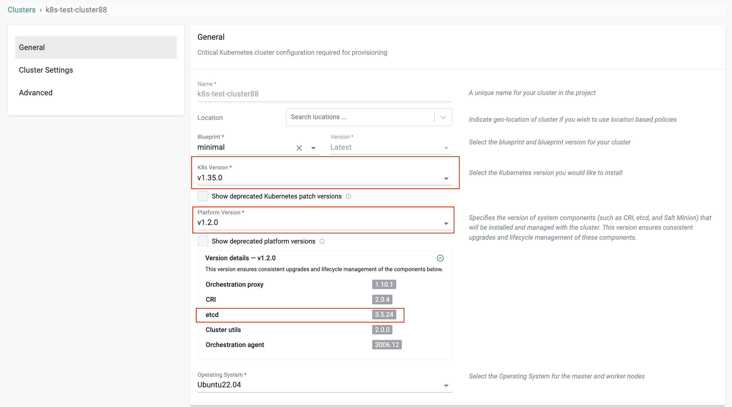 Kubernetes v1.35 requires etcd version 3.5.24 which is delivered as part of Rafay Platform Version 1.2.0. When creating new clusters based on Kubernetes v1.35, select Platform Version 1.2.0 along with it. For upgrading existing clusters to Kubernetes v1.35, upgrade to Platform Version 1.2.0 first or together with the Kubernetes upgrade. Clusters cannot be provisioned or upgraded to Kubernetes v1.35 without Platform Version 1.2.0.