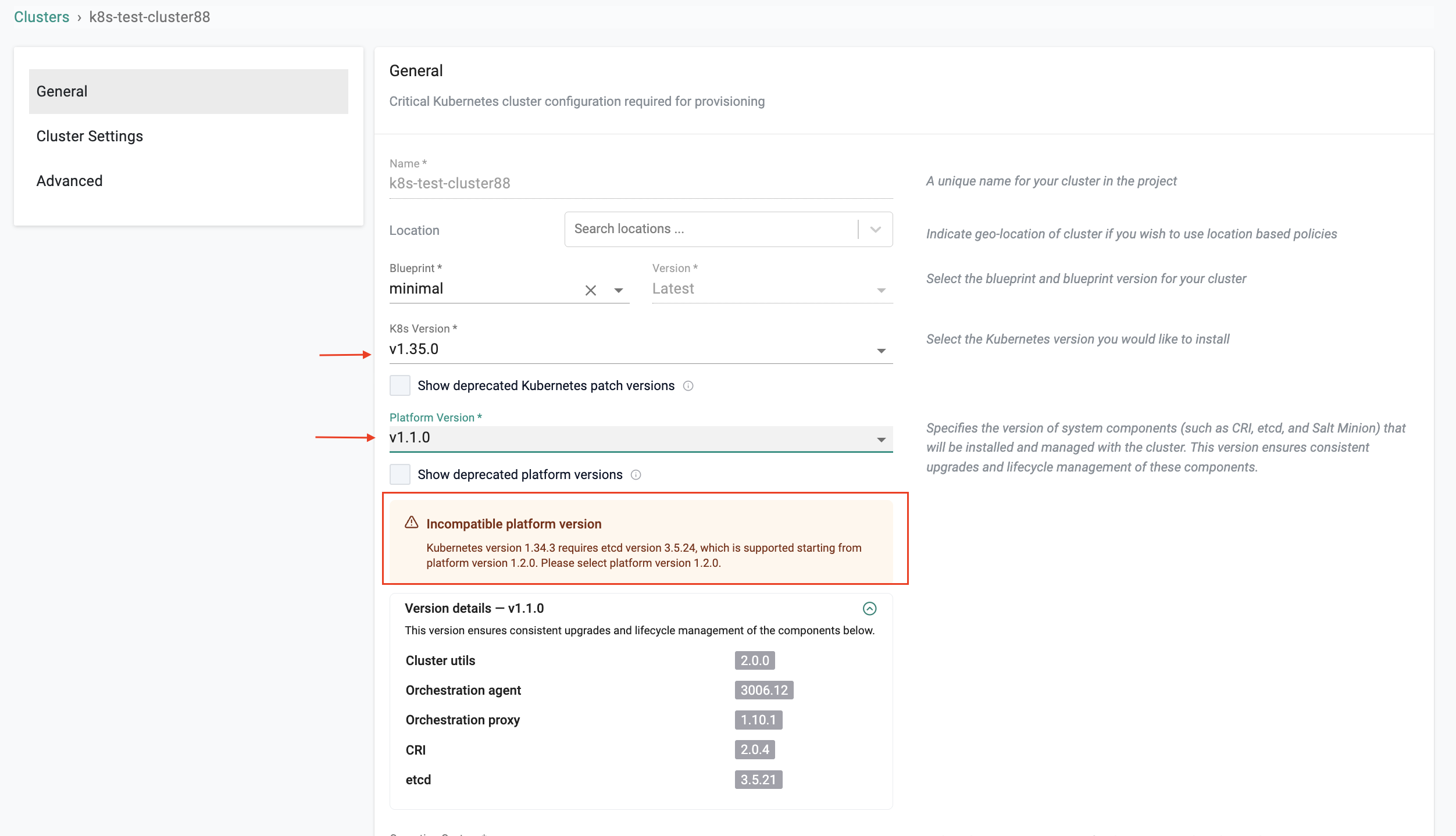 - When creating a new cluster on Kubernetes v1.35, select Platform Version 1.2.0 along with it to proceed.