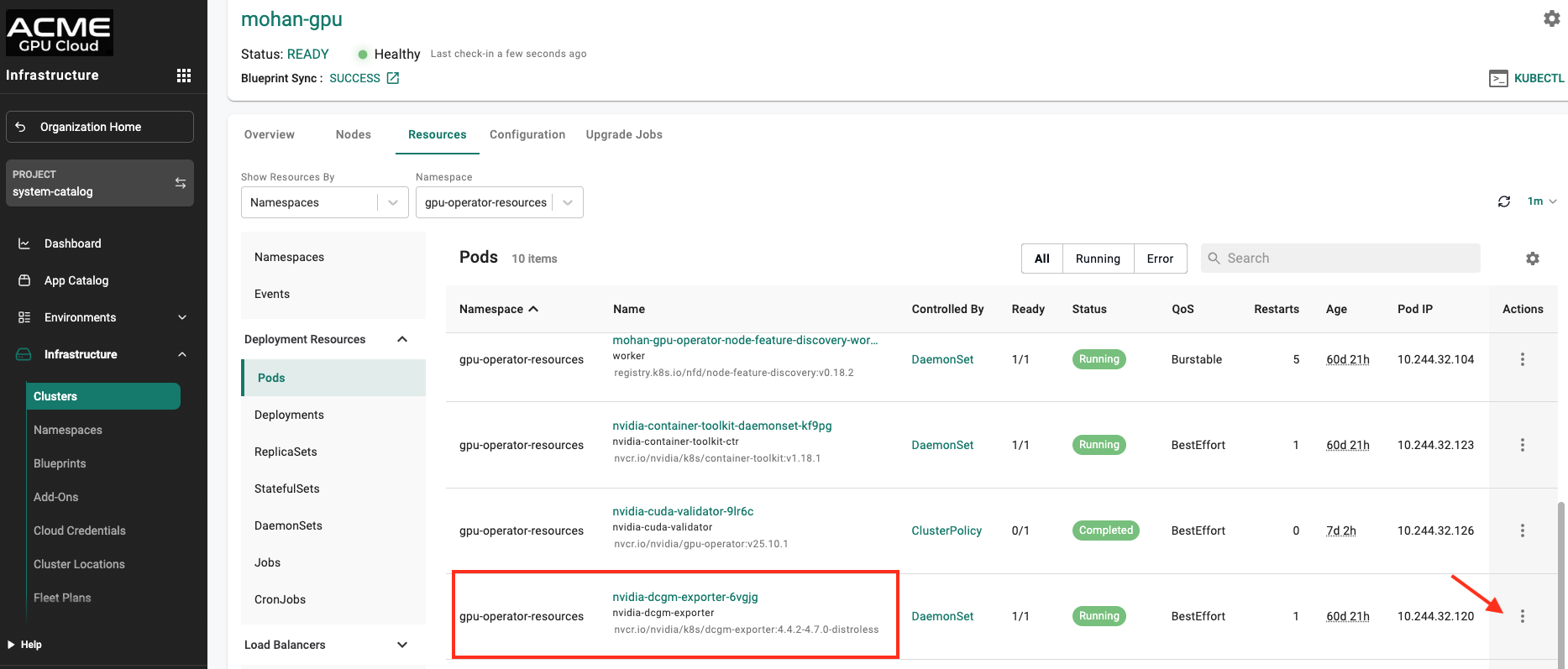 Next, click Pods under the deployment resources section. You should see the GPU Operator-related pods for the cluster.