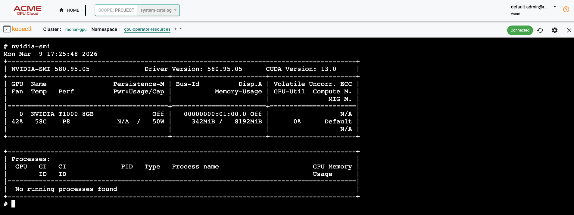 Before onboarding AI or ML workloads, platform teams can confirm that GPU nodes are correctly configured and visible to the Kubernetes runtime.