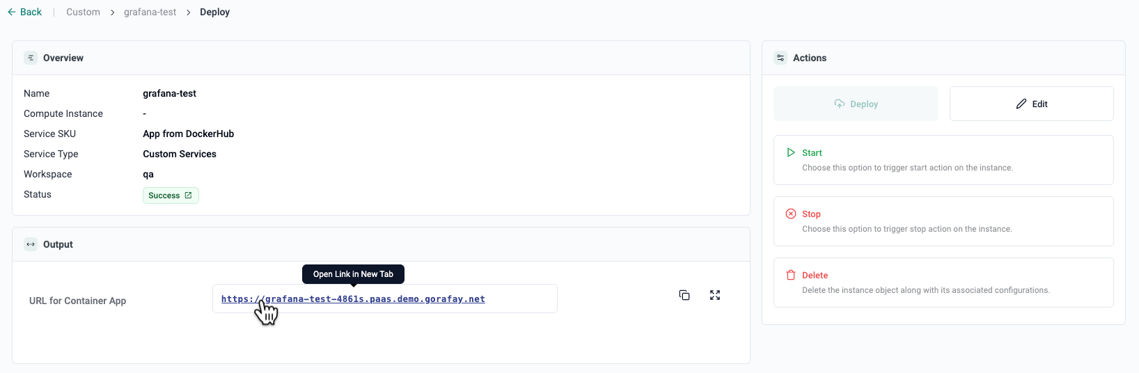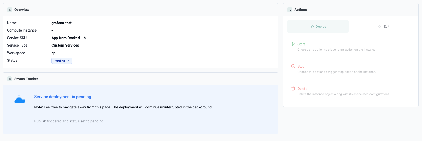 Click on Deploy. This will initiate the deployment of the Grafana app on the provider's environment. The user will see an in-progress notification