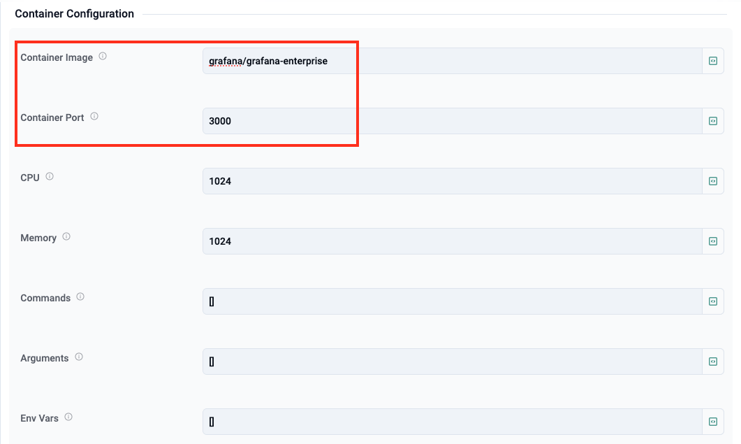 In the "Container Configuration" section, update the following to reflect our Docker command