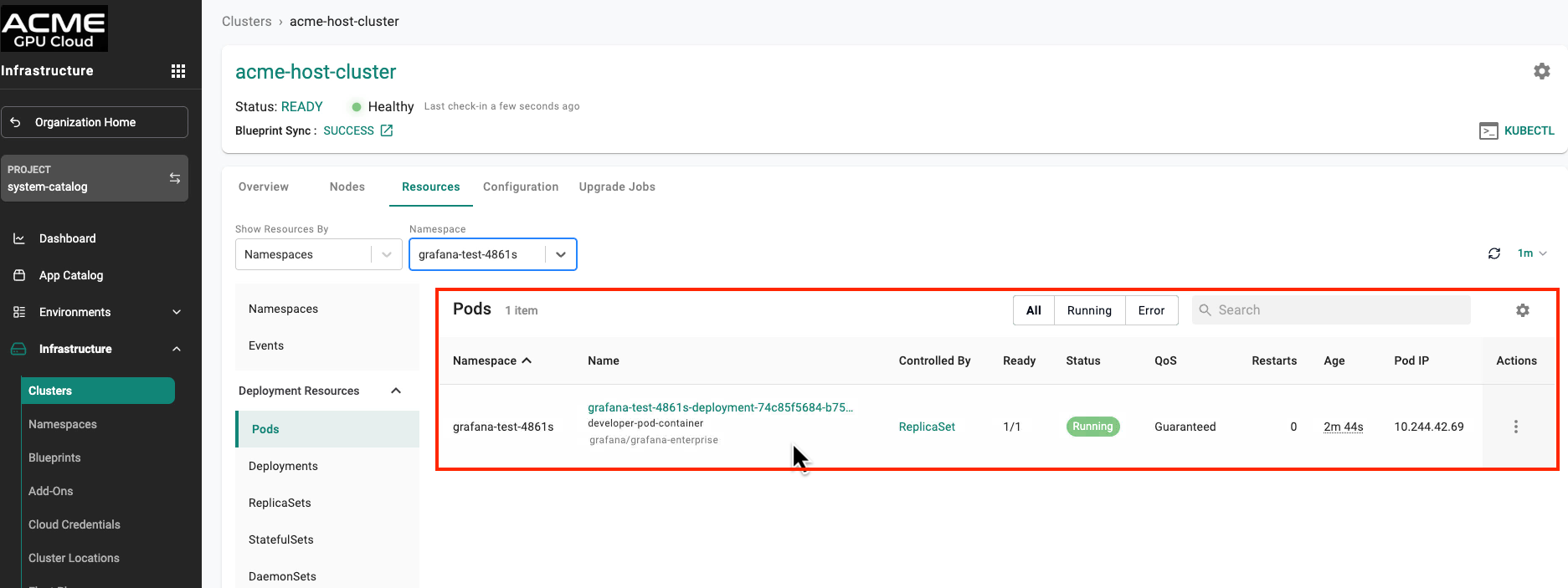 The Rafay platform has autogenerated and deployed k8s pod and a backing deployment.