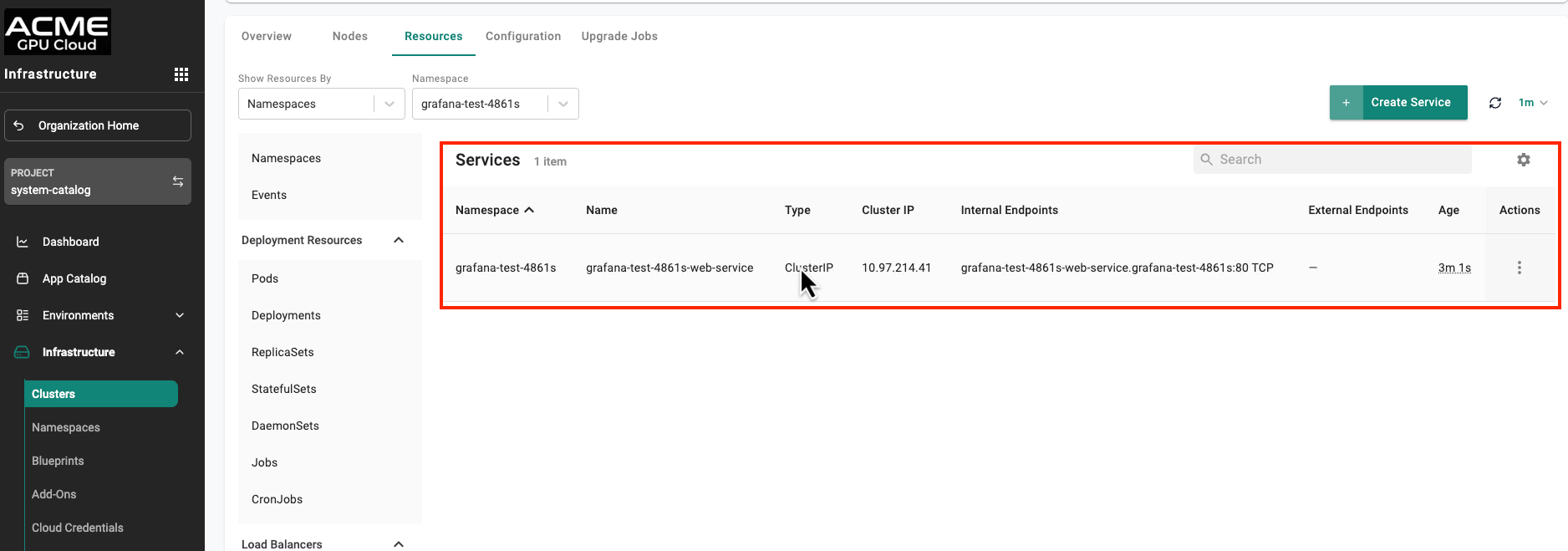The Rafay platform has also autogenerated and deployed a service for Grafana